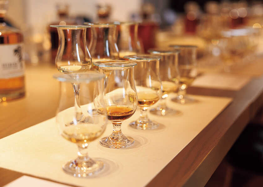 フラスコの中には多彩な原酒。それぞれの香りをとおして、ブレンダーの技を体感