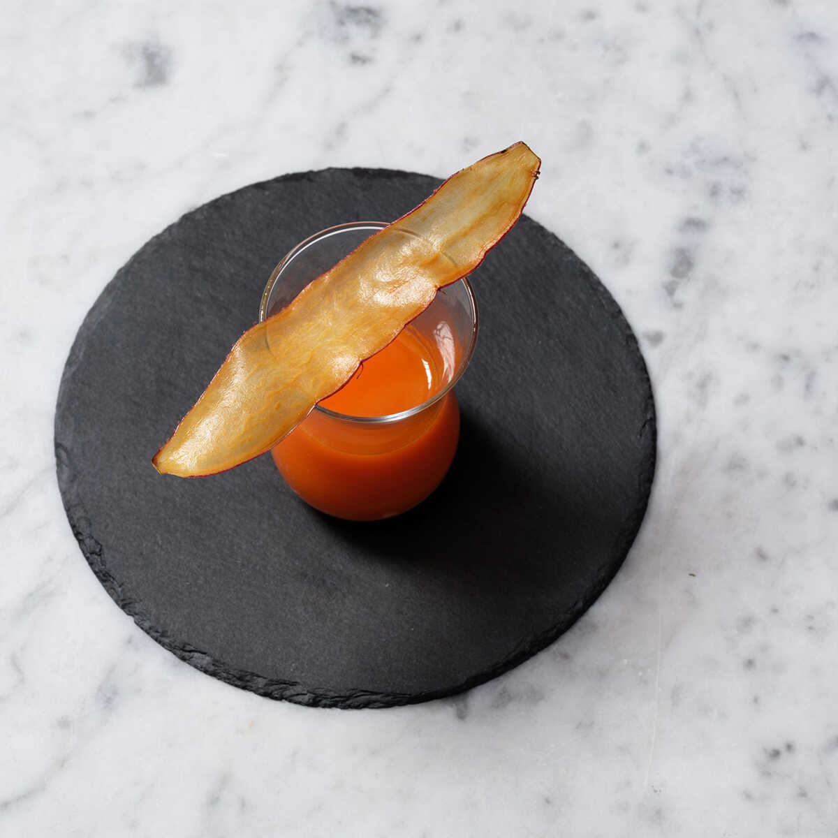 “金沢野菜のコールドプレスジュース 五郎島金時のチップ”は、フレッシュな金沢野菜を栄養抜群のジュースにし、ほんのり甘い五郎島金時のチップを添えた。最初にふさわしい食欲をかき立てる一品。