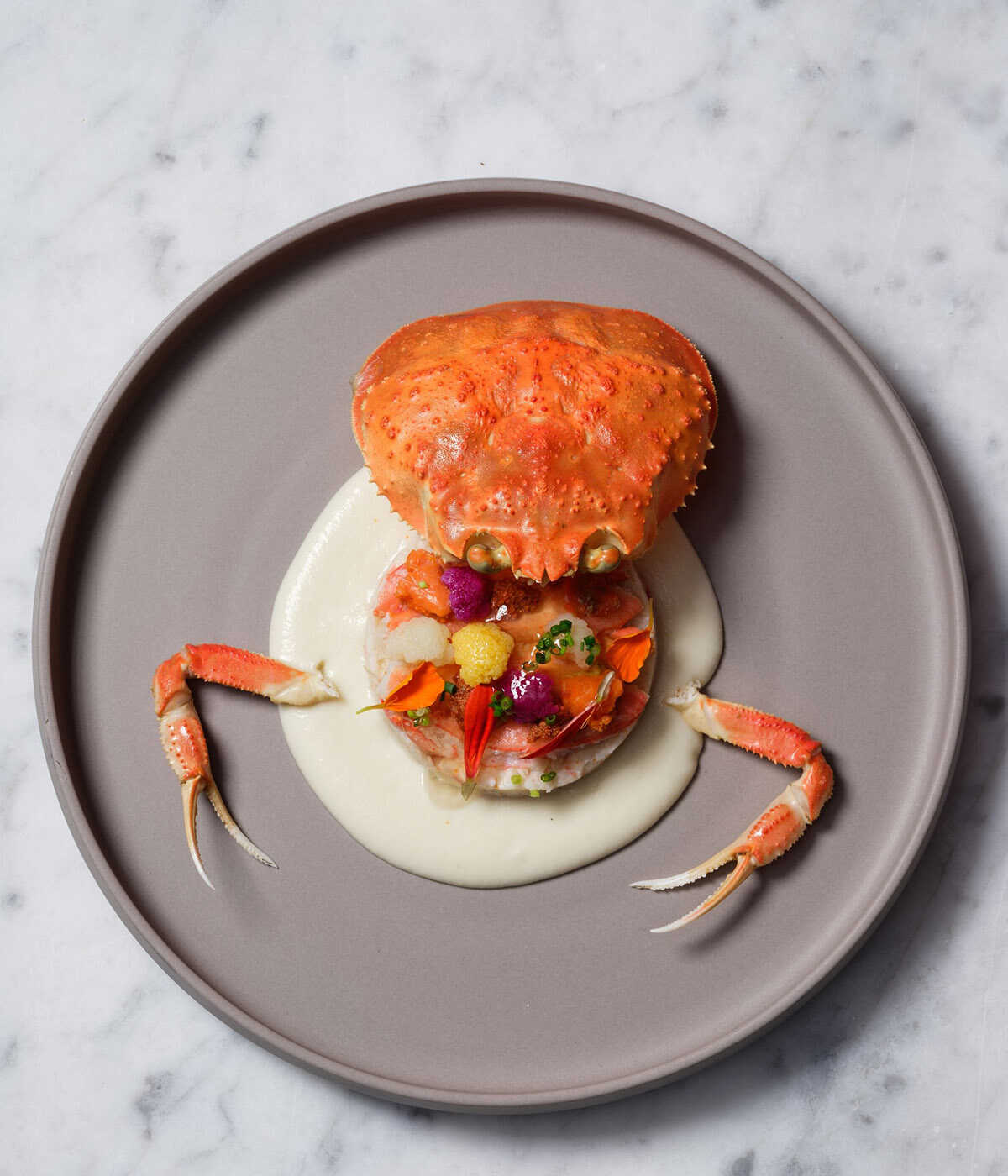 石川の冬の味覚の代名詞である“香箱ガニ”を用いた冷前菜が、“金沢港産香箱ガニ カリフラワーのピューレ カラフルカリフラワー 大野醤油を使った蟹酢ジュレ”。香箱ガニの濃厚な内子とプチプチ食感の外子、ほぐし身を合わせて甲羅の中にたっぷりと詰めた。まろやかなカリフラワーのピューレ、地元の大野醤油を使った酸味の効いた蟹酢のジュレを乗せメリハリある味わいに。