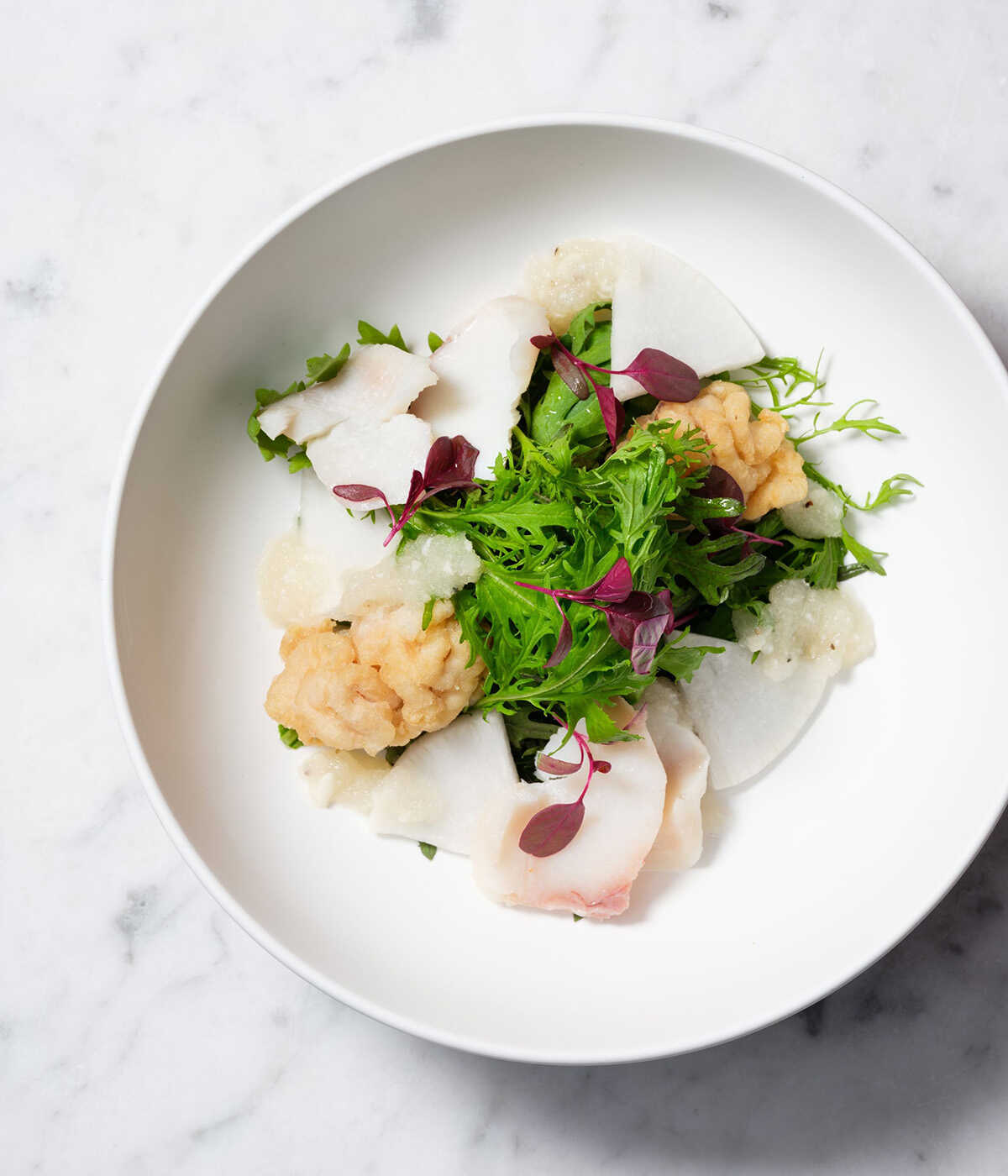 鱈を主役にしたのは“金沢港産鱈のフィレと白子のフリット 金沢春菊 二塚からしな OTM アマランサス 源助だいこんドレッシング”。丁寧に低温調理した鱈と、石川県産米粉をまぶした白子のフリットを取り合わせた。上品な香りの金沢春菊、山葵に似た辛味の二塚からしな、源助だいこんのドレッシングなど、野菜の存在感も抜群だ。