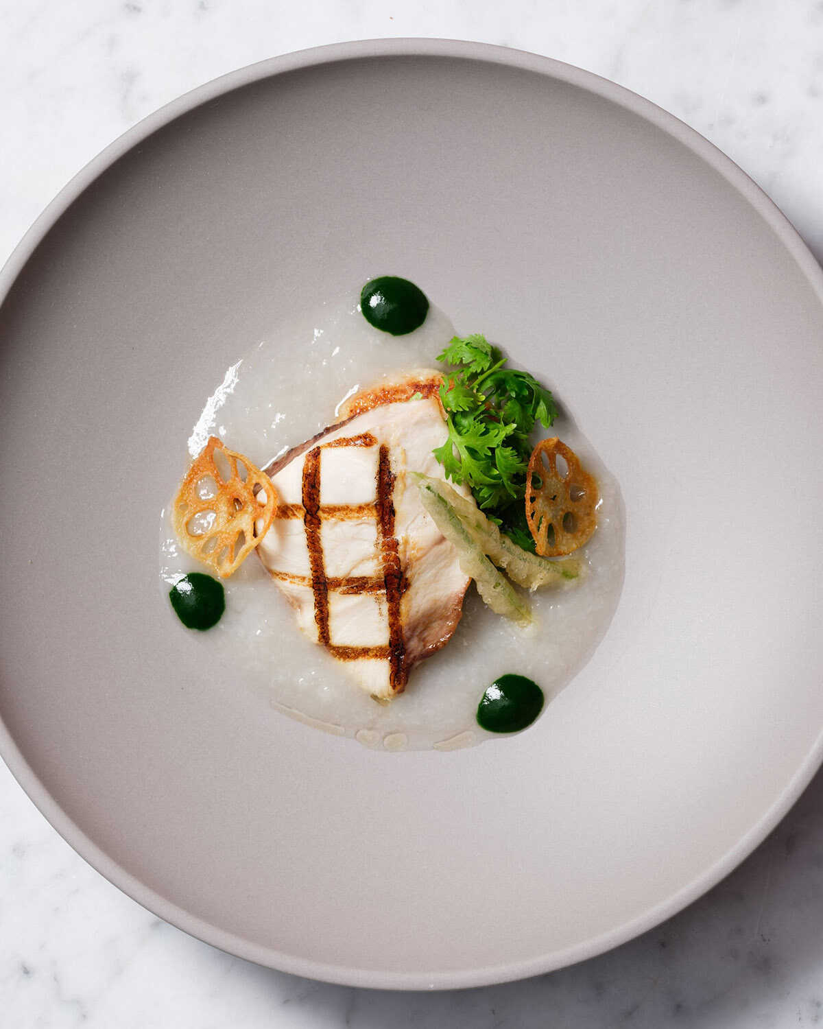 ・金沢産塩糀でマリネした金沢港産鰤のグリル 金沢せり 加賀れんこんのガレットとすり流し