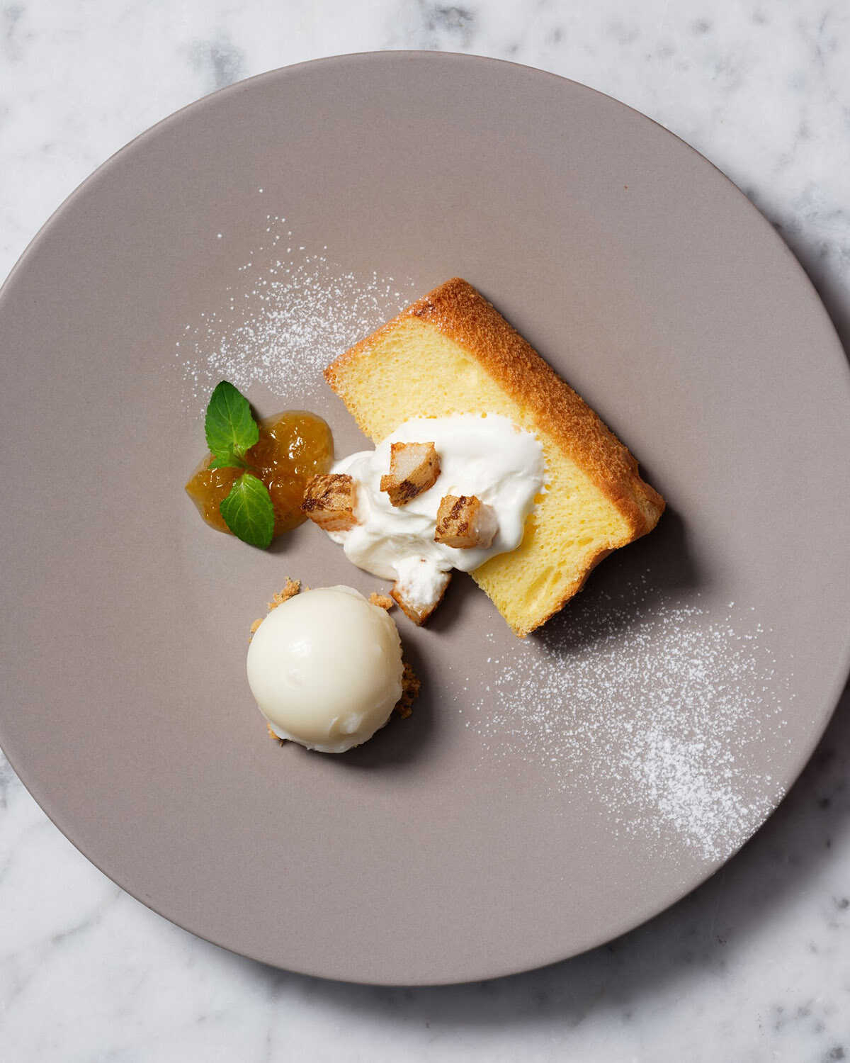 “金沢藤五郎のシフォンケーキ 金澤やまぎし養蜂場のさくら蜂蜜アイスクリーム きよし農園の柚子ソース”は、すりおろした金沢藤五郎を生地に練りこみ焼き上げた、軽やかながらも弾力のあるシフォンケーキ。市内の養蜂場が手がける蜂蜜のアイスクリーム、地元の柚子ソースを添え、“金沢の甘味”にあふれている。