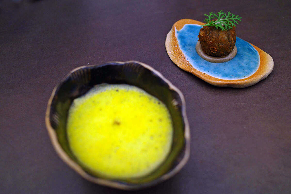 最初のアミューズは2品が同時に登場。“黒トリュフのフリット、コンテチーズ、セラーノチリ”は、サクサクっとした黒トリュフのコロッケで、コンテチーズのコクがたまらなく美味しい。“カリフラワーのコンソメ、ターメリックフォーム、ブラックペッパーオイル”は、優しい味わいのカリフラワーのコンソメに、ターメリックフォームの心地よい香りとブラックペッパーオイルで適度に刺激的だ。