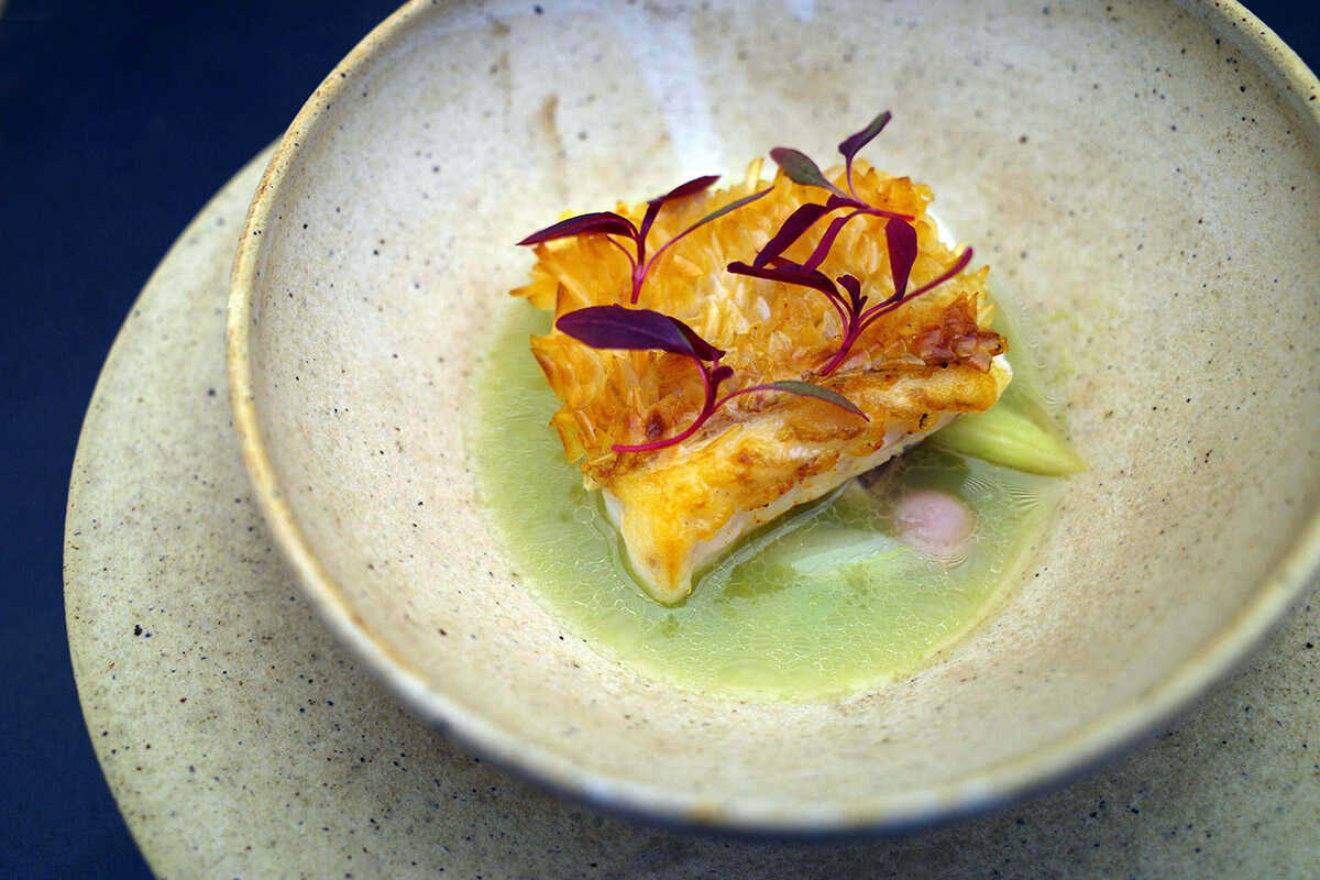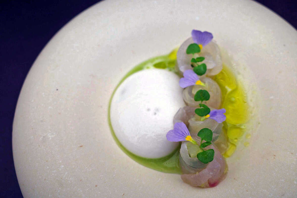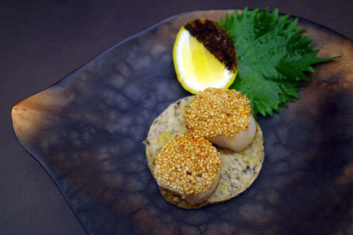 前菜は真鯛か帆立貝からセレクト。真鯛のカルパッチョがきれいにクルリと巻かれているのが“真鯛 山葵、セロリ、ココナッツホイップ、王林のジュース”。滋味がたっぷりで、王林ジュースの気品のある甘味と、ココナッツホイップの懐かしいような甘味がよいバランス。仕上げにソースがかけられる。黒七味のアクセントが印象的なのが、“北海道産帆立の胡麻クラスト 海苔バター、紫蘇、レモン、黒七味”。上に載せられた胡麻クラストが小気味よく、帆立貝の上味を存分に味わえる。海苔バターは、濃厚で馥郁たる香り。