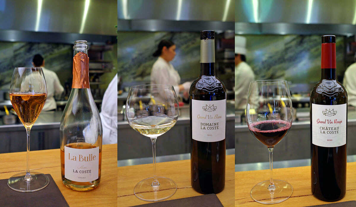 当日はフランス・プロヴァンス地方の歴史ある“シャトー・ラ・コスト”のワインが提供された。“ラ・ビュル エクストラ・ブリュット ロゼ”は華やかな色合いをもつフランス・プロヴァンスのスパークリングワイン。エクストラ・ブリュット=極辛口に仕上げられているから、最初の一杯やアミューズにぴったり。柑橘類のフレッシュな香りが印象的なのが、“グラン・ヴァン・ブラン 2023”。シャルドネがもつリッチなコクが素晴らしい白ワインで、魚介類にマッチする。“グラン・ヴァン・ルージュ 2020”は鴨肉の鉄分と相性抜群の赤ワイン。カシスやブラックベリーなどの熟した黒系果実の香りに、力強い口当たりとエレガントな凝縮感がある。