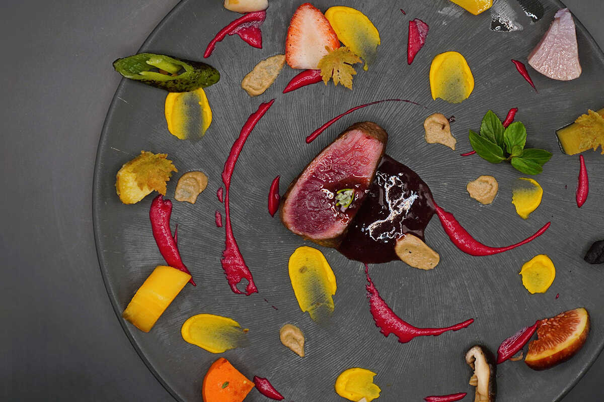 メインディッシュに据えられたのが、千葉県の“ホンシュウジカ”。エゾシカに比べると、やわらかくて繊細な味わい。周りにはたっぷりの野菜が、整然と配されている。千葉県のオーガニック野菜で、蒸し、焼き、茹でなどさまざまな調理法を施しているので、どれも個性が際立つ。ハスカップのソース、焼きみかんのピューレ、茄子とミントのピューレが添えられているので、好みで“味変”を試してみて!