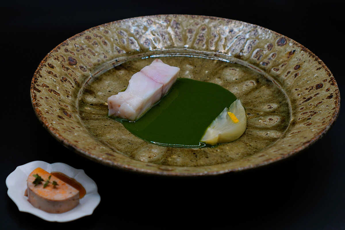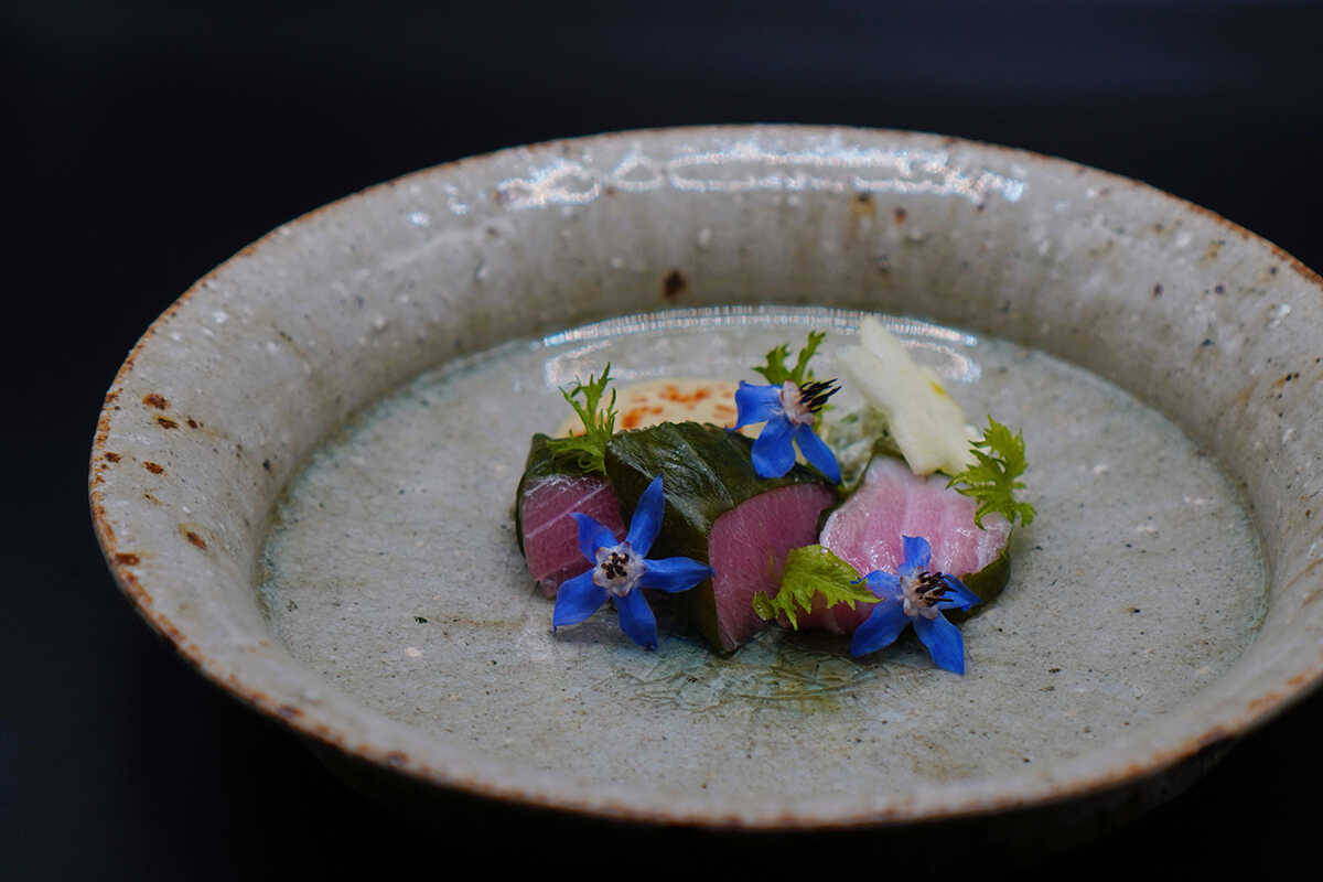 エグゼクティブシェフを務めるのはパコ・ラ・モニカ氏。コペンハーゲンの〈ノーマ(Noma)〉、バンコクの〈ガガン(Gaggan)〉、フェロー諸島の〈コックス(KOKS)〉など、世界を代表するレストランで腕を磨く。ブランディングを統括するアレッシオ・ゴルニ氏は、美術、イベント制作、ホスピタリティなど多領域にわたる経験をもち、ヨーロッパ、オーストラリア、日本でキャリアを築いてきた。この才能あふれるチームが提供しているのが、“季節のコース+ペアリング”(3万6000円)。日本各地から選び抜いた旬の食材を用いた8〜10品のおまかせコースだ。
