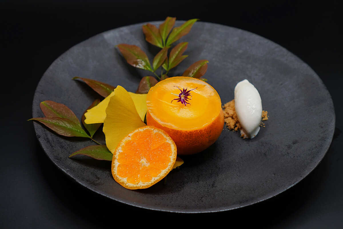 デザートはみかんの器を用いた一品。みかんのタルタル、みかんと10種類のハーブと中国茶“ラプサンスーチョン”のスープに、新潟県長岡市のミルクジェラートときなこのクランブルを添えた。優しい甘さが広がり、心身ともにリラックスさせられる。