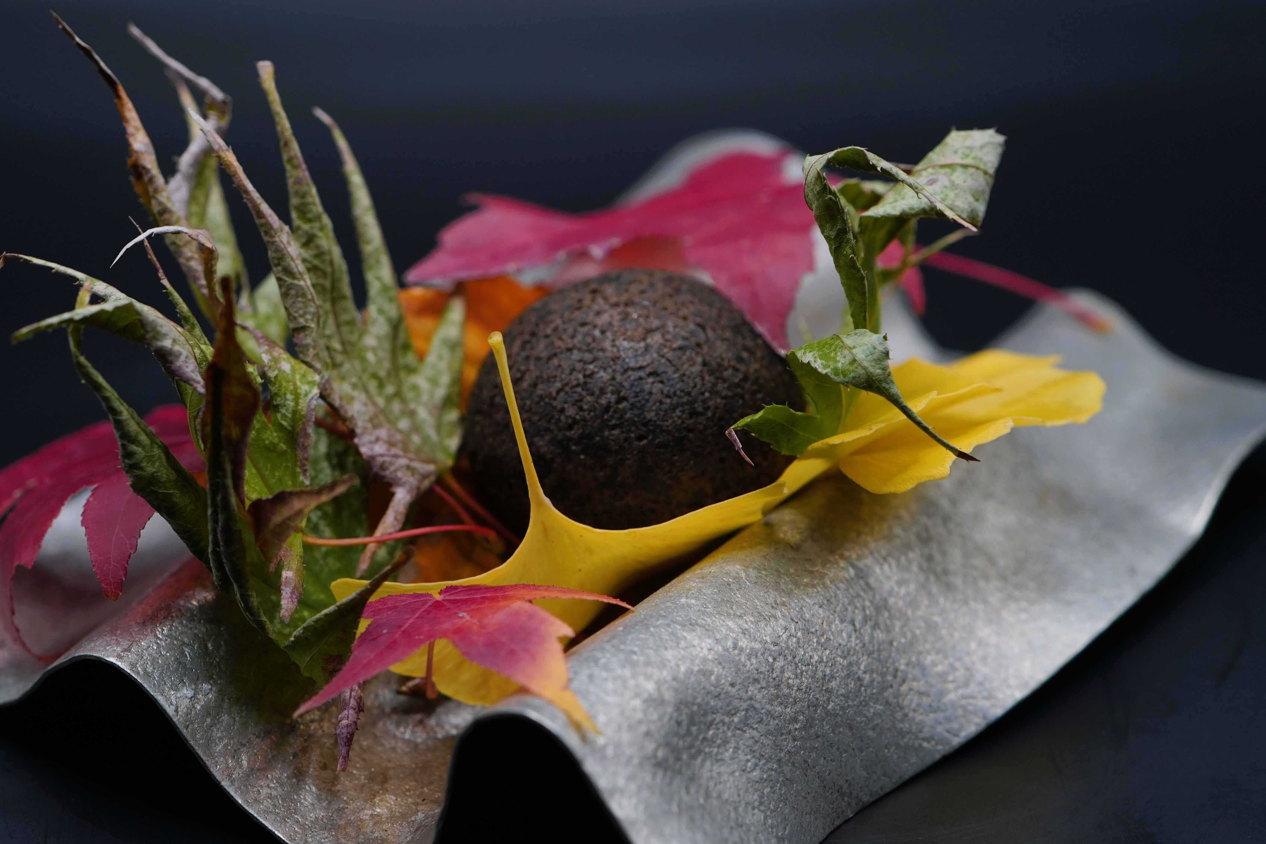 アートを存分に味わった後で、永島氏が1階のシェフズテーブルへと誘ってくれる。スタートは季節の葉に彩られた“揚げブリオッシュ”。カリカリふわふわの食感で、中に包まれたクリームチーズとイクラはなめらかな口当たり。