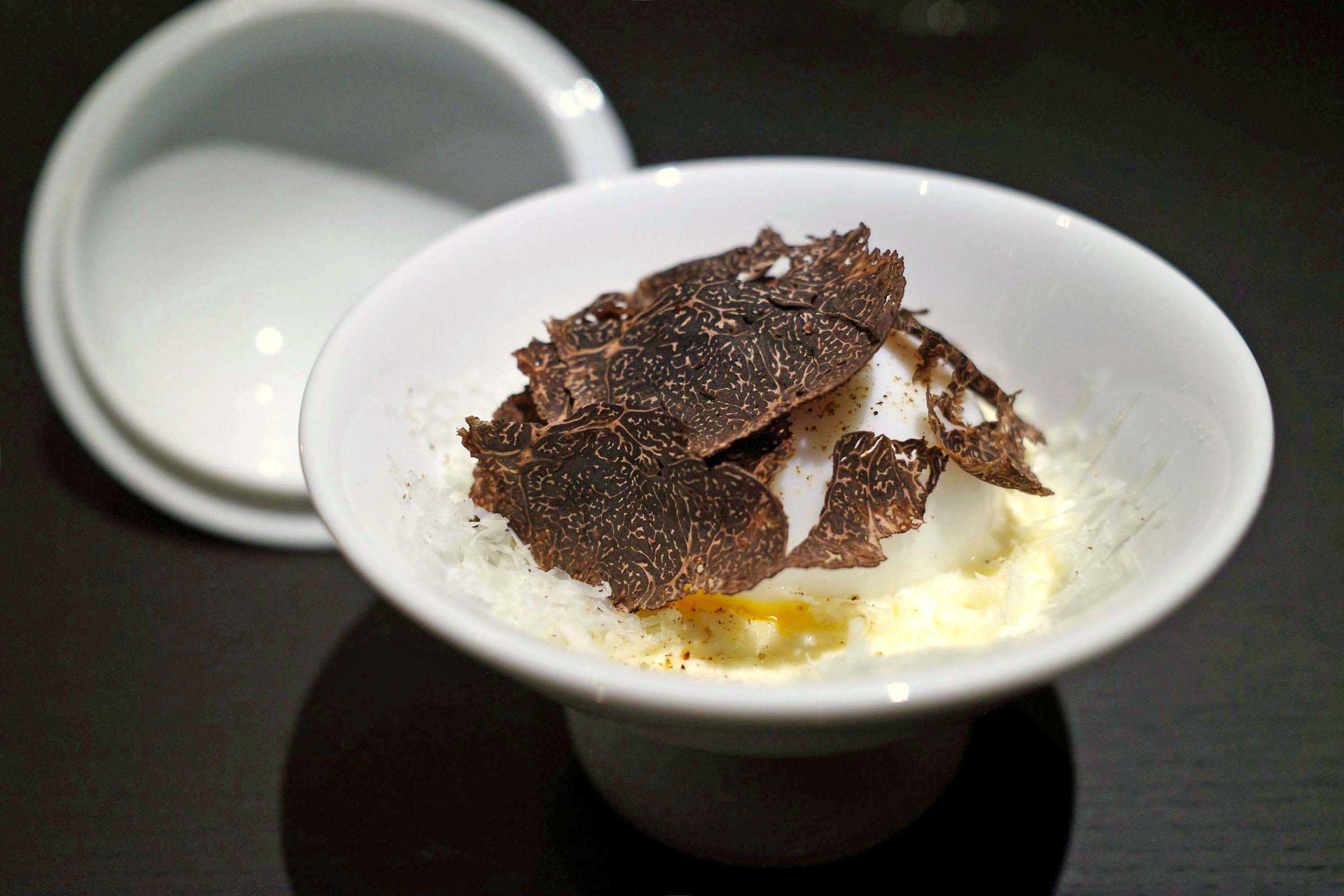 “カルボナーラの再構築”では、トリュフの妖艶な香りを堪能できる。トリュフを注入した玉子を割り、惜しげもなくスライスされたトリュフを混ぜ合わせて食べれば、我を忘れるような口福に満たされる!