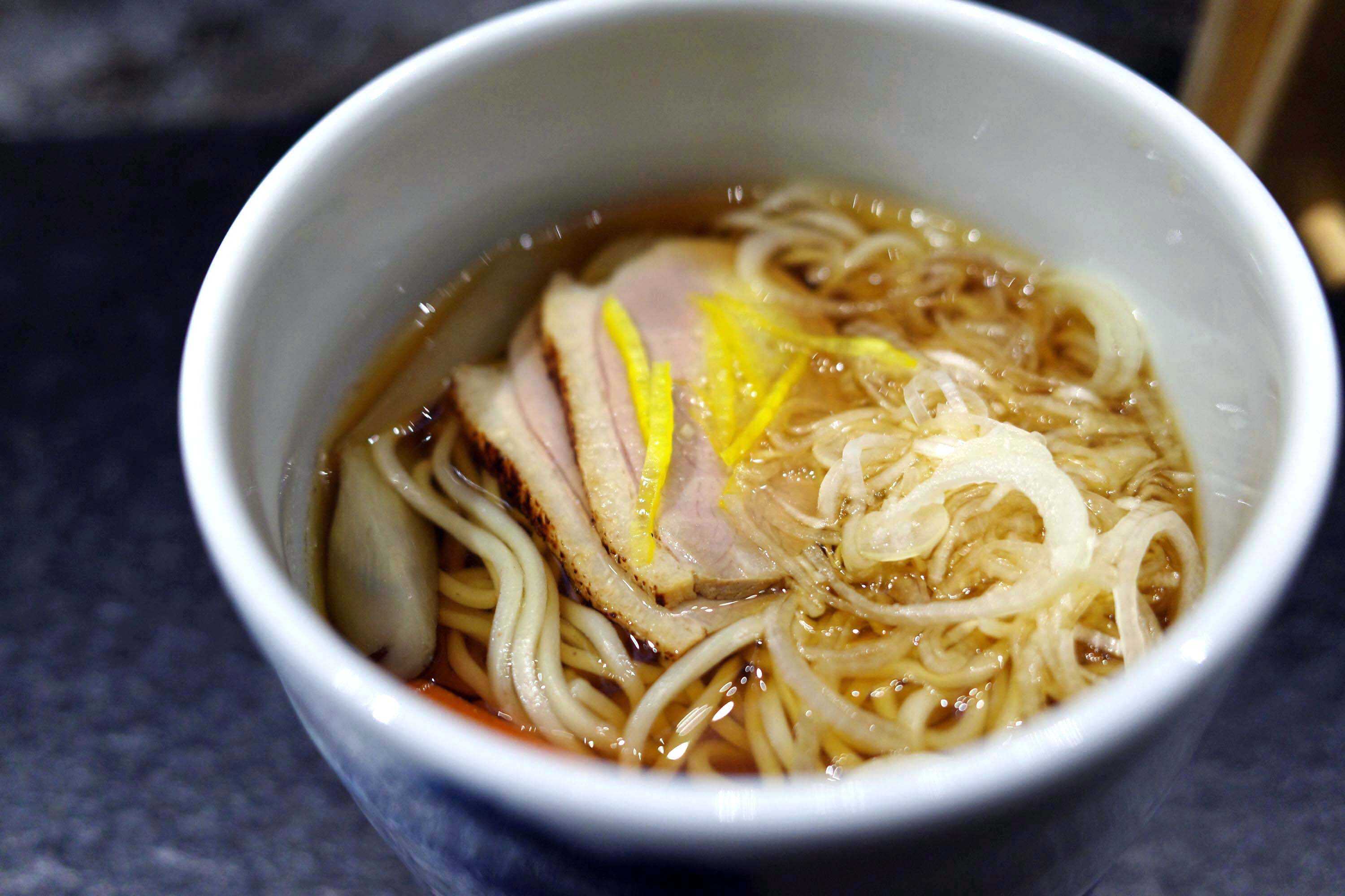 “鴨けんちん蕎麦”は、ほっとできる一杯。鴨の旨味がつゆに深みを与え、味わいは重層的。蕎麦は軽やかな喉越しで、柚子のアクセントも心地いい。