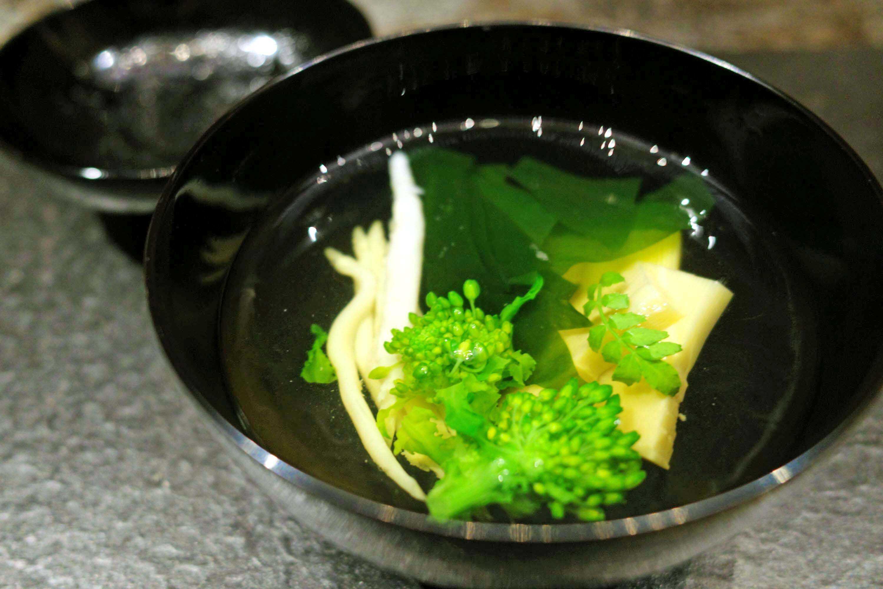 繊細な味わいを楽しめるのが、“若竹椀 白魚 菜の花”。澄んだ出汁に菜の花の緑が映えて、見た目からして清々しい。白魚の繊細な旨味と若竹のほのかな甘味がよい取り合わせ。