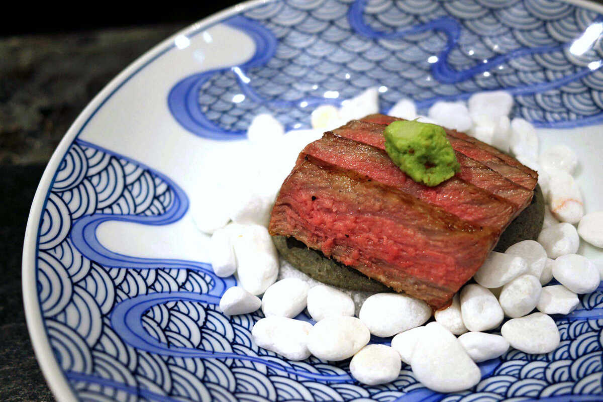 “国産牛サーロイン古代焼 天王寺蕪”は、鈴木氏こだわりの肉料理。牛肉を麻布に包み、さらに白亜紀の地層の砂で血抜きする技法で下処理したものを、炭火で焼き上げた。焼き色と断面の美しさが白眉で、サーロインは噛むほどに肉汁があふれる。