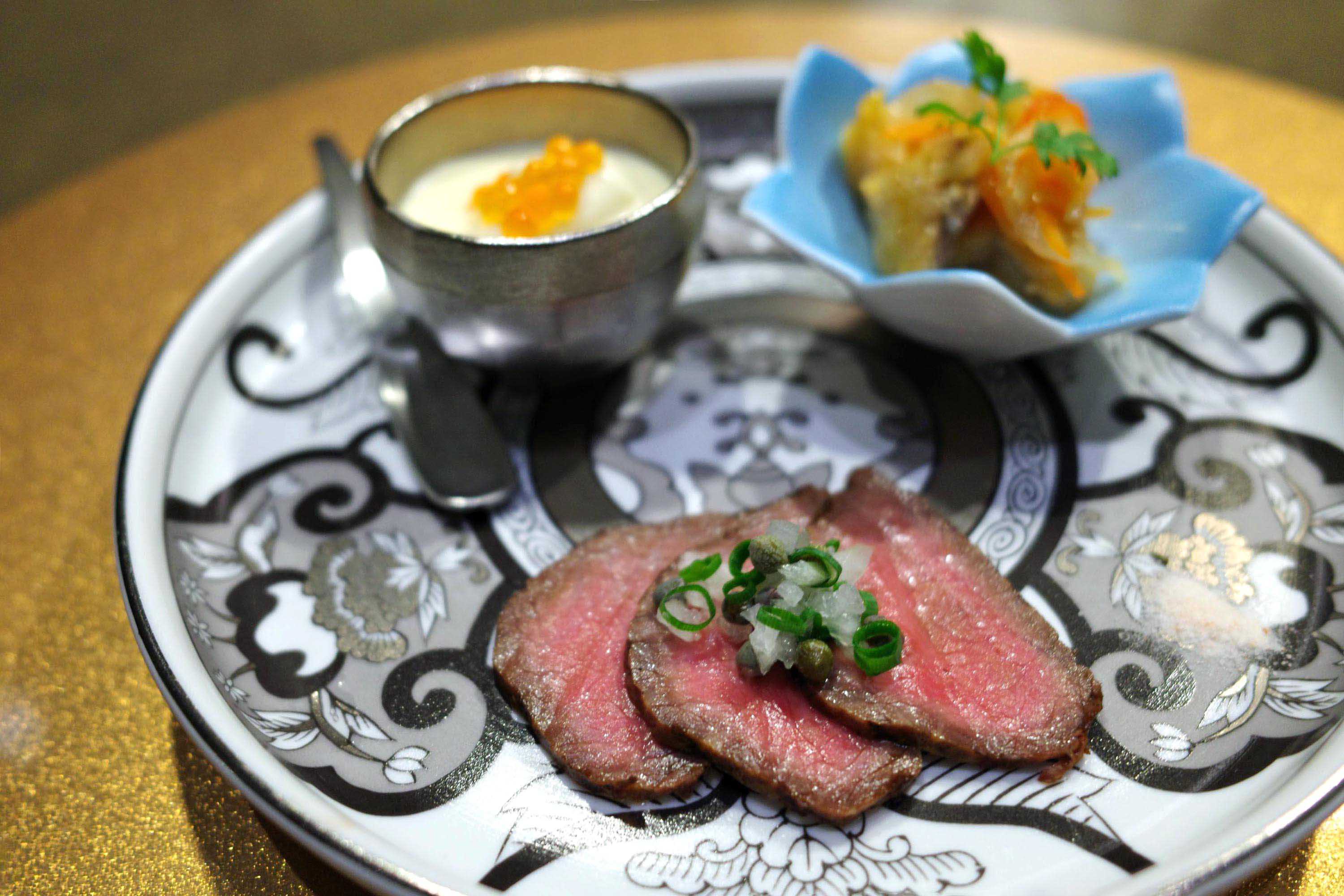 “前菜は3種類の盛り合わせ”。酸味の効いた白身魚のエスカベッシュ、クリーミーなカリフラワーのムース、赤身の旨味を湛えた和牛のタタキとバラエティに富んでいる。