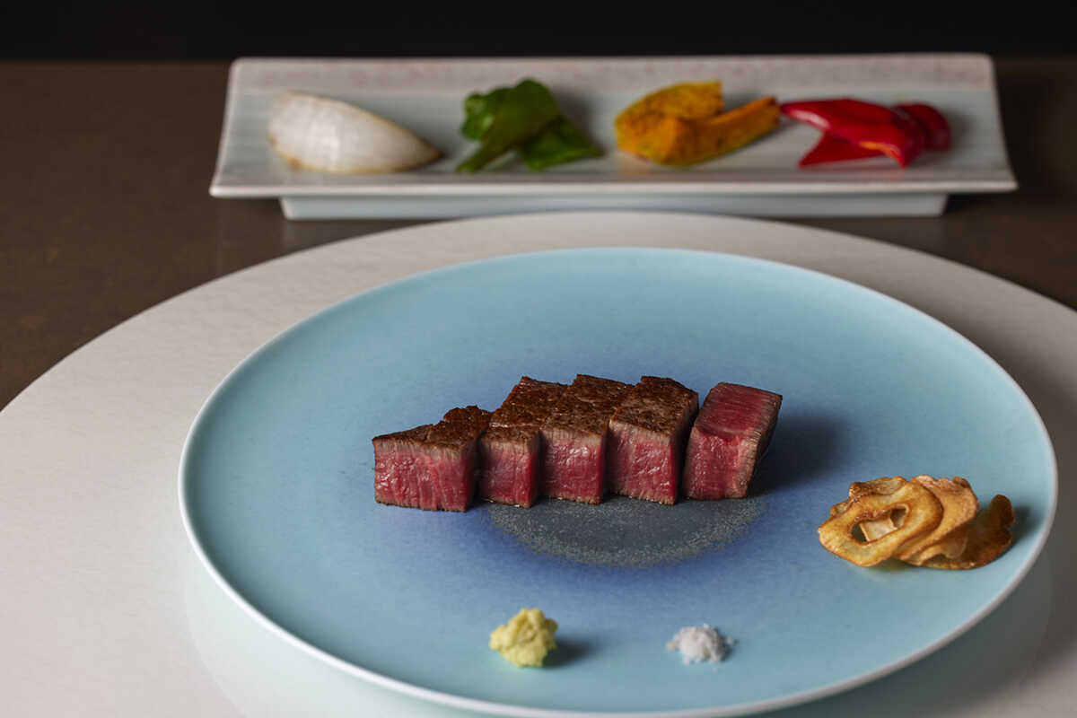 そんな木村氏の鉄板料理を堪能するには、ディナーコースの“天星”(2万9000円)がおすすめ。〈天祐〉の看板食材であり、ほかではなかなか味わえない希少ブランド和牛、“石垣島きたうち牧場プレミアムビーフ”を存分に楽しめる。この牛は、石垣島の大自然の中で大切に長期肥育された黒毛和牛で、常温で脂が溶けるほど融点が低く、赤身の深い味わいと甘く芳醇な和牛香が特徴。木村氏がその肉質のクオリティに惚れ込み、出荷頭数が月4頭と少ないながらも、定番メニューとして用意。