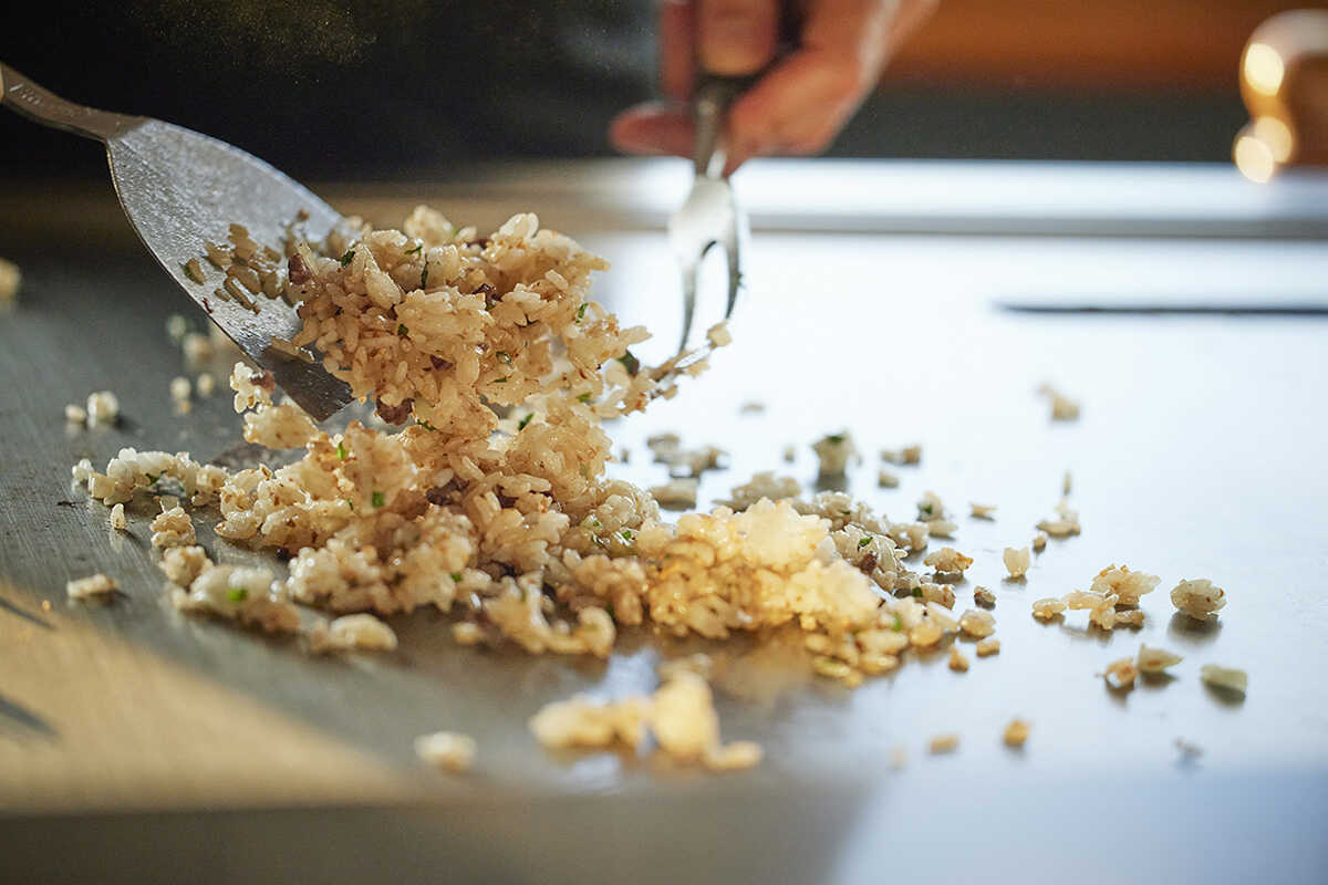 “お食事”は、ガーリックライスへのアップグレードが人気。黒毛和牛の脂身は使わずに赤身だけを使い、あとは大葉とガーリックだけで仕上げた。シンプルながらも香り高いので、最後まで美味しく食べられる。