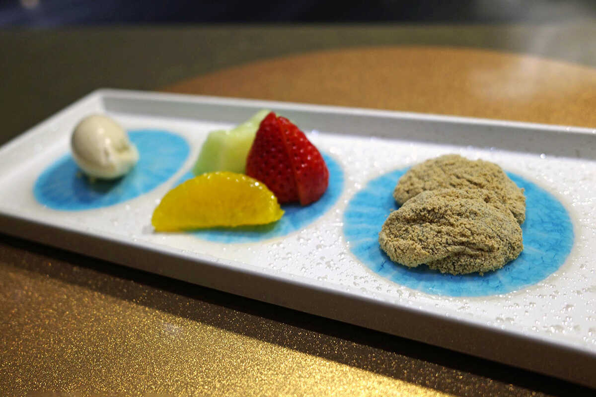 “季節のデザート”も、木村氏が自ら作るというこだわりよう。もっちりとしたわらび餅に、香ばしいほうじ茶アイスクリームは、最後を締めるのに相応しい珠玉の甘味。