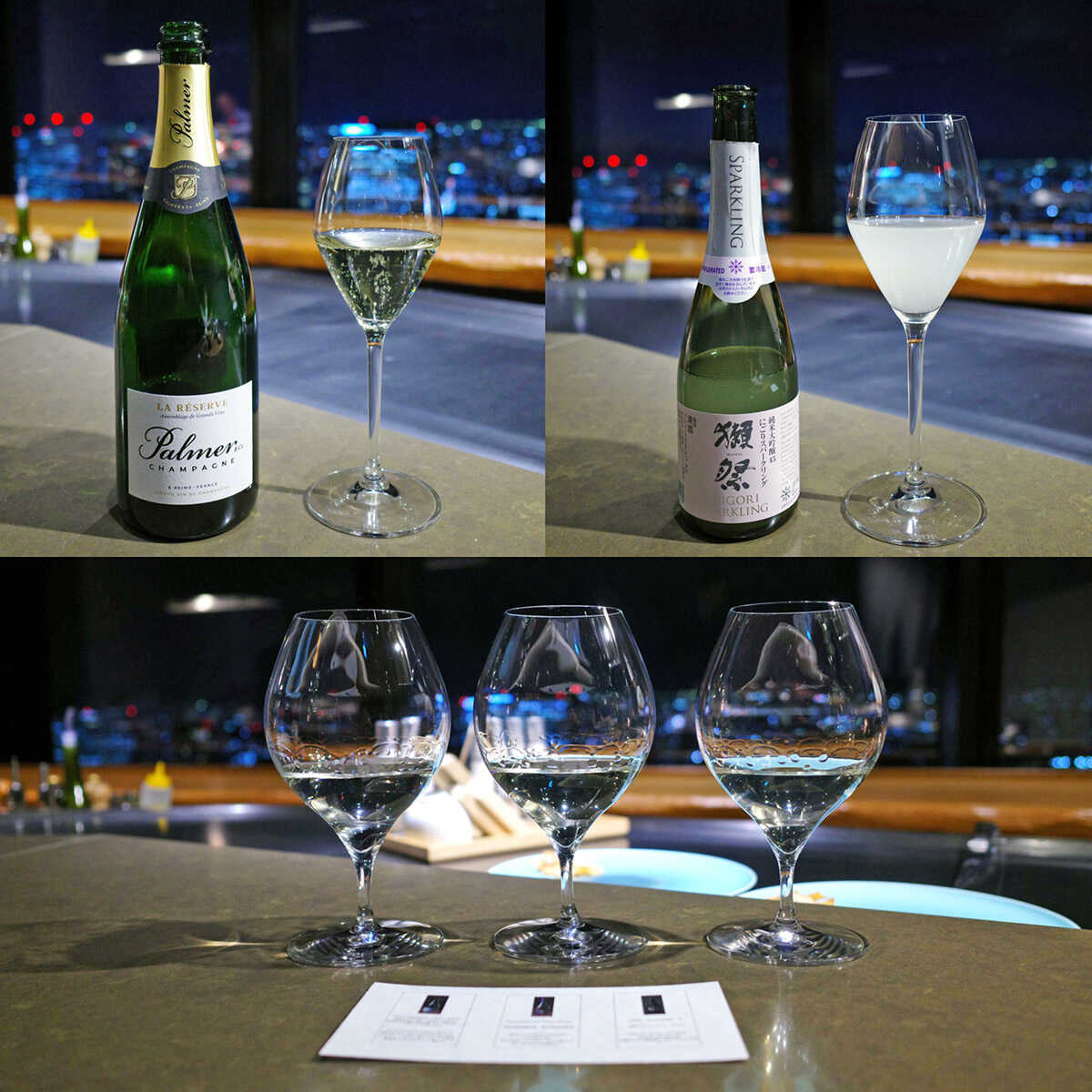 上左:“パルメラ・レゼルヴ”、上右:“獺祭 純米大吟醸 45 にごりスパークリング”、下:“日本酒ペアリング”