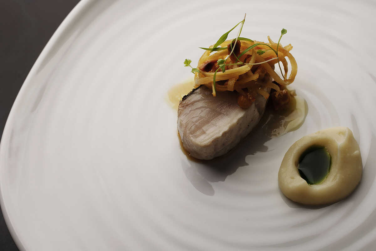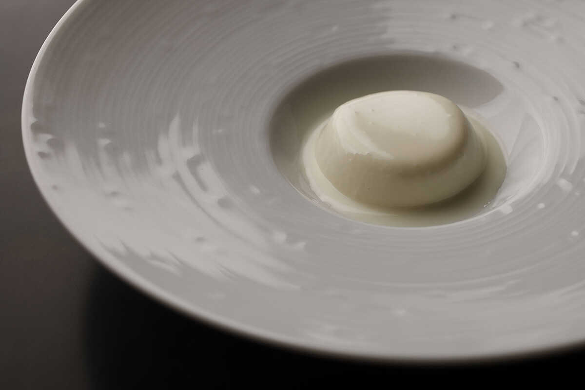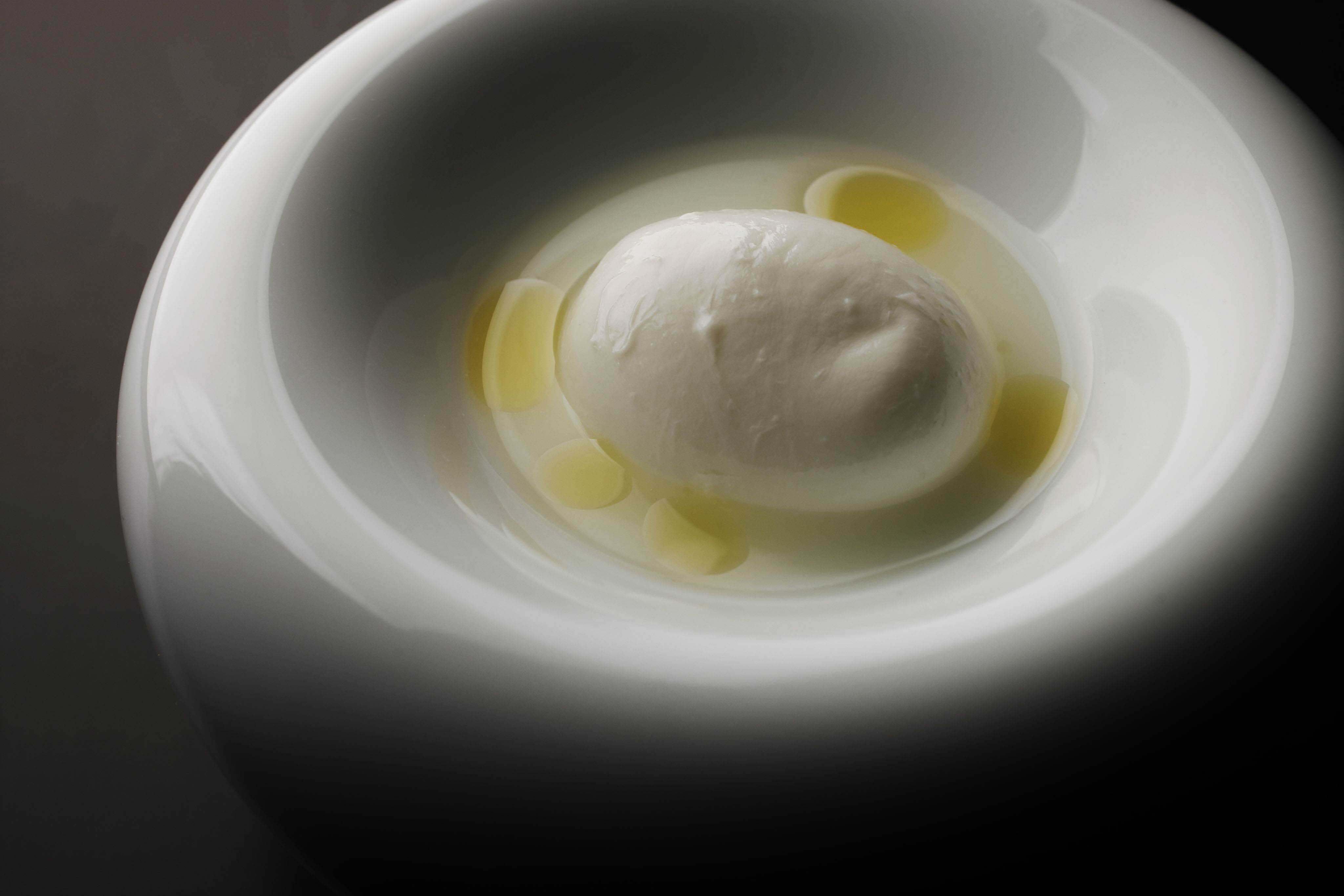 “モッツァレッラ”は国内随一の職人、竹島英俊氏が手掛ける千葉県にある“クルックフィールズ(KURKKU FIELDS)”の水牛モッツァレラ。爽やかな乳清(ホエイ)に蕪の香りを移したソースとシチリアのオリーブオイルを合わせ、メリハリを加えた。
