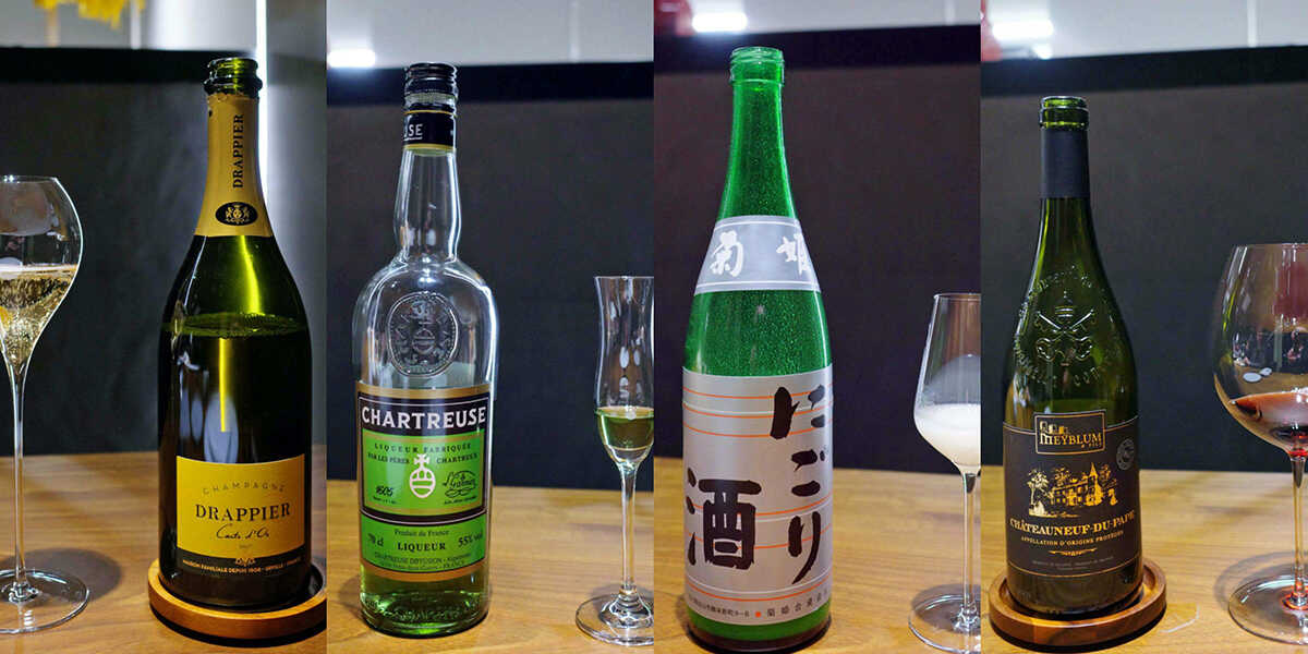左から、“ドラピエ カルト ドール ブリュット”、“シャルトリューズ・ヴェール”、“菊姫 にごり酒”、“メイブラム&フィス シャトーヌフ デュ パプ 2023”