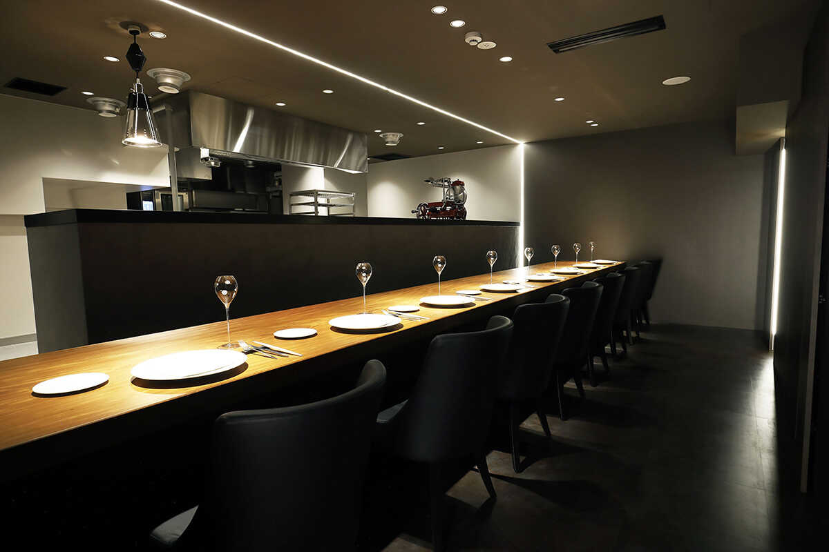 ほんの少し見上げるような対面ステージ構造は、奥行きのある二段構えで、臨場感が抜群。オープンキッチンから聞こえるパチパチと炭火の爆ぜる音がムードを盛り上げる。