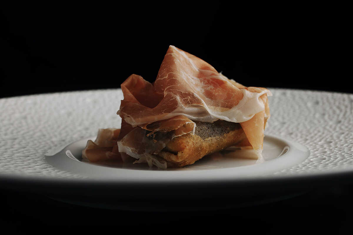 “プロシュット”はイタリア〈ベルケル〉の生ハムスライサーで極薄にスライスし、ふわふわの空気を包み込んでいる。野菜とチーズを詰めたフリットが下にしのばされているので、合わせていただくといい。