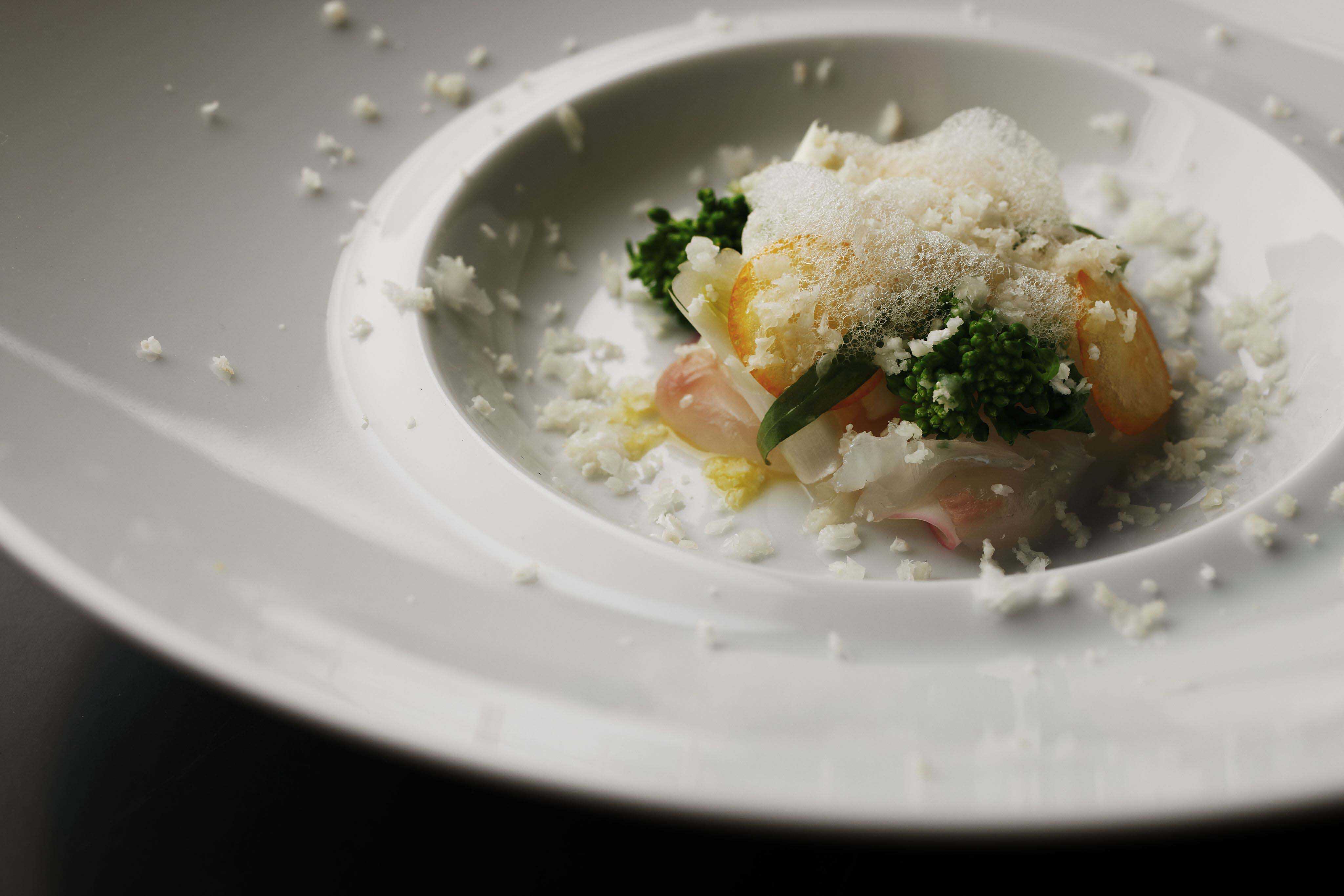 ウルイなどの春野菜を取り合わせたのが“平目”。平目のカルパッチョは適度な脂がのった上味で、カリフラワーのクリームとスライスの甘みが寄り添う。煎り酒の泡や金柑が香味を加える。
