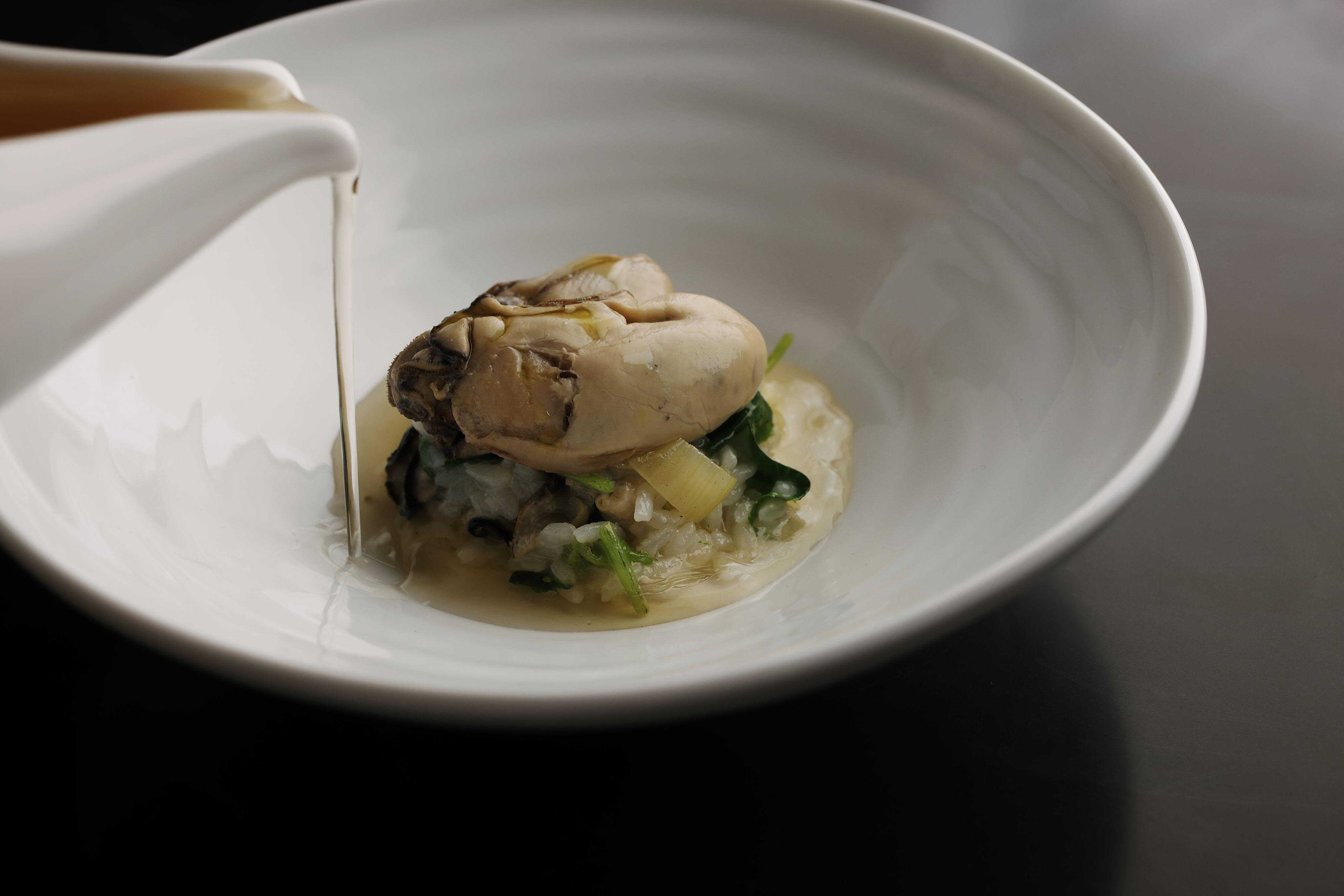 “牡蠣”は、乳清の中で温度調整した牡蠣と豆乳で茹でた牡蠣のリゾット。宮城県にある阿部晃也氏の〈奥松島水産〉の牡蠣は、クリーミーな味わい。同じく宮城県にある、木村正明氏の〈竹取倶楽部〉の米“かぐや姫”は優美な甘みをもつ。