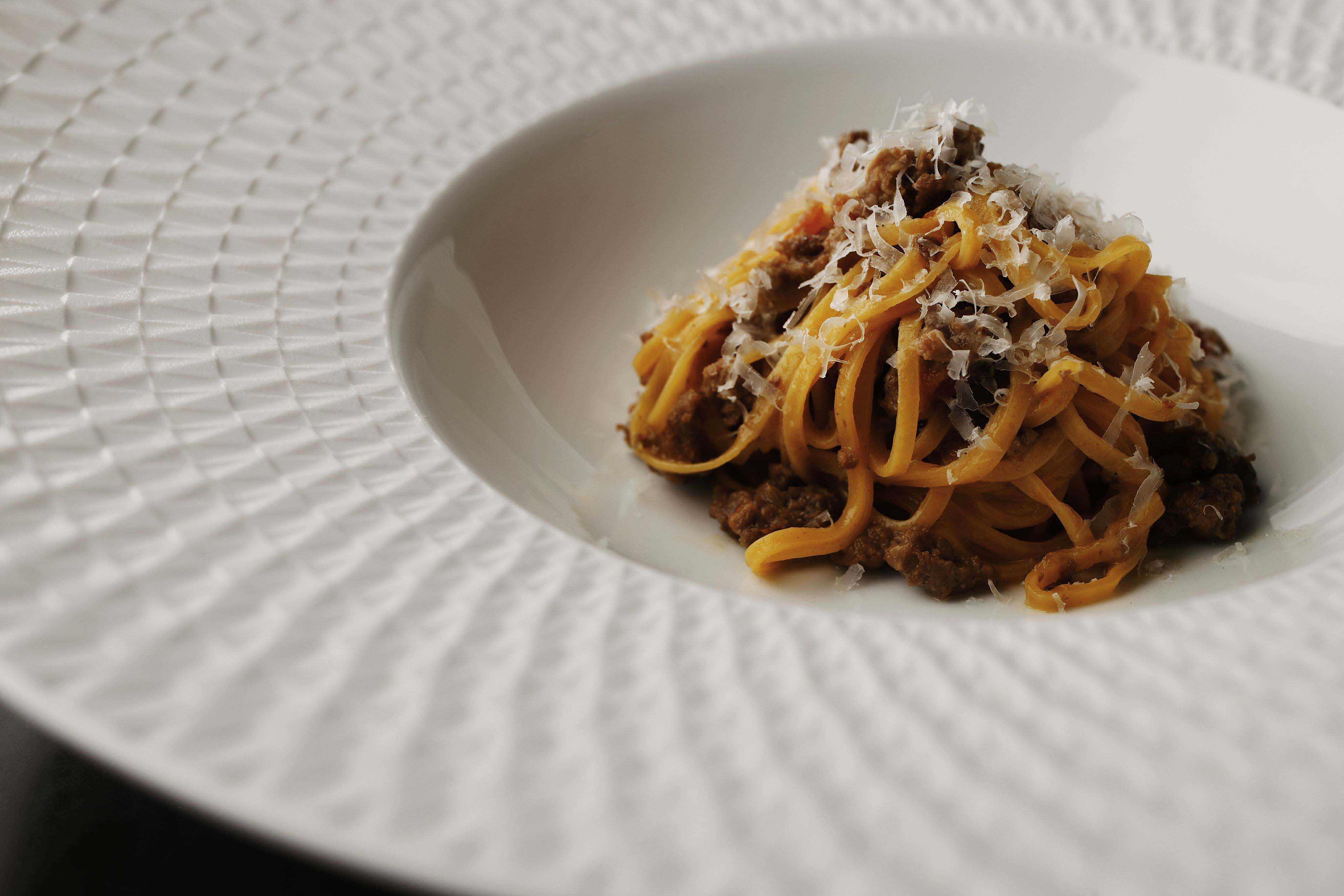 自家製の手打ちロングパスタ“タヤリン”を合わせたのが、“猪”。白ワインで煮込んだ猪のラグーソースは、ポルチーニ茸やアンチョビと高め合い、旨味が抜群だ。