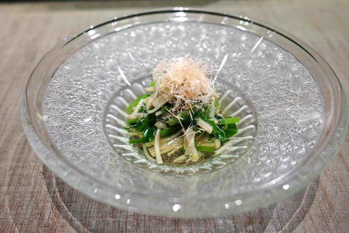 “芹と榎茸のお浸し”は、高知県の農家から届いた野菜を用いたさっぱりとした先付。芹のしゃきしゃき感が食欲をそそる。