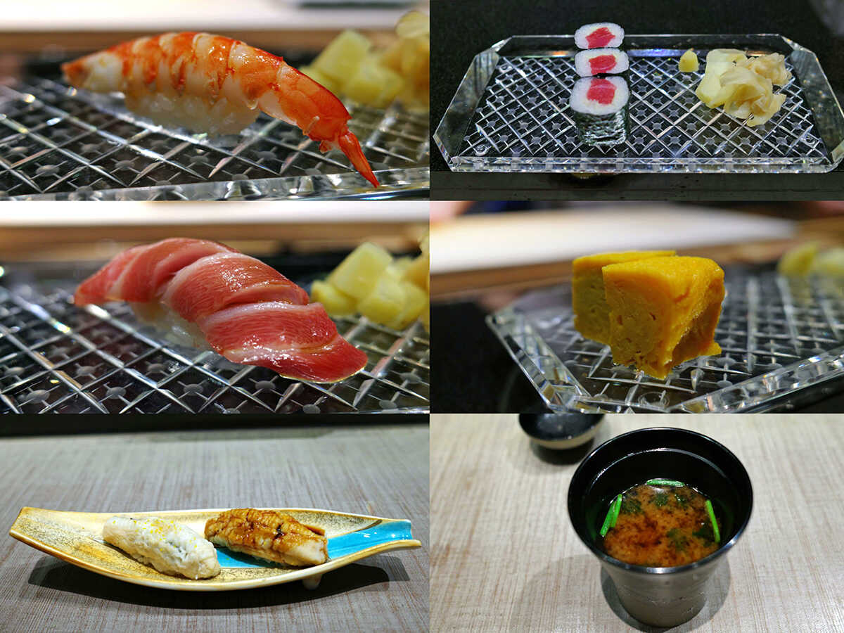 左上から、車海老、トロ、穴子。右上から、鉄火巻き、玉子、お椀