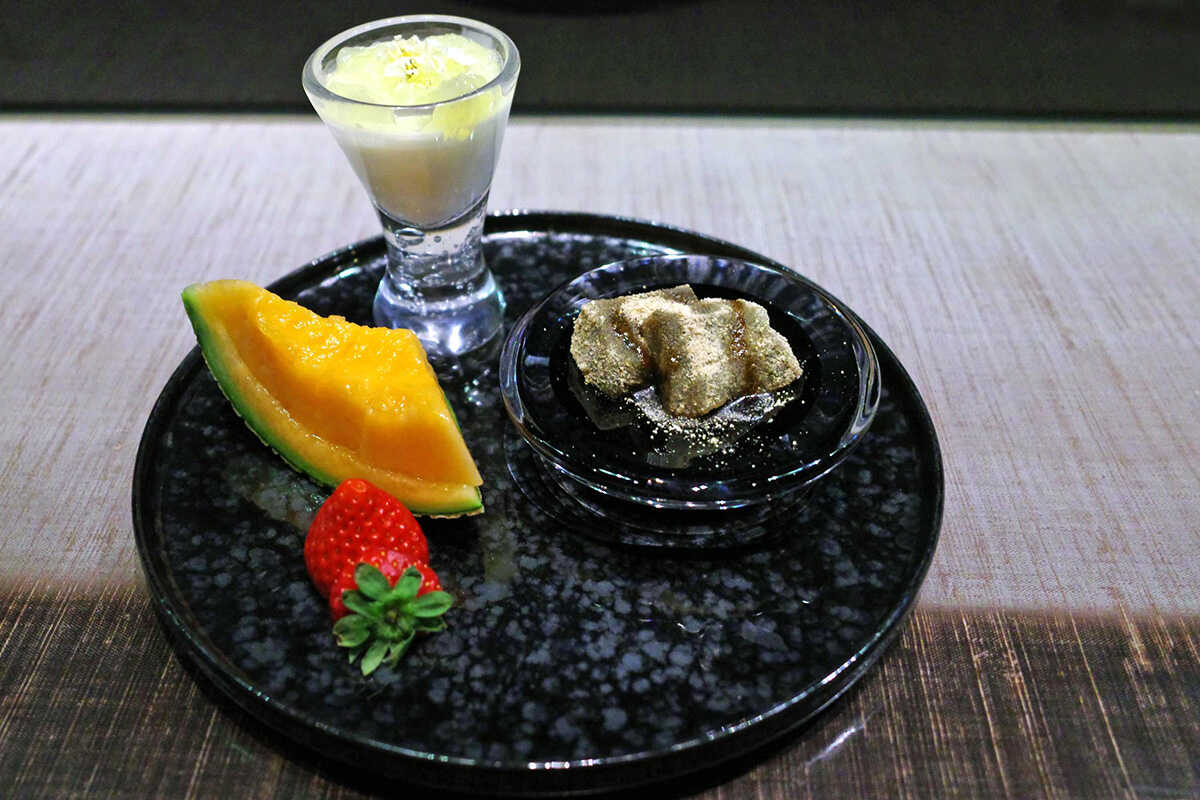 デザートは嬉しい盛り合わせ。口当たりのいい文旦のゼリーとブランマンジェ、わらび餅に、メロン。そして埼玉県のイチゴ“あまりん”。