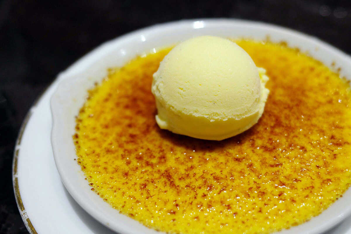 デザートは移動してゆっくりと過ごせるのが〈さざんか〉のいいところ。ソルベやアイスクリーム、フルーツ、クレームブリュレから選べる。クレームブリュレはカラメルがパリッとして、バニラの風味が実に豊か。上に添えられたバニラアイスクリームとともに食べると、重奏的な味わいとなる。