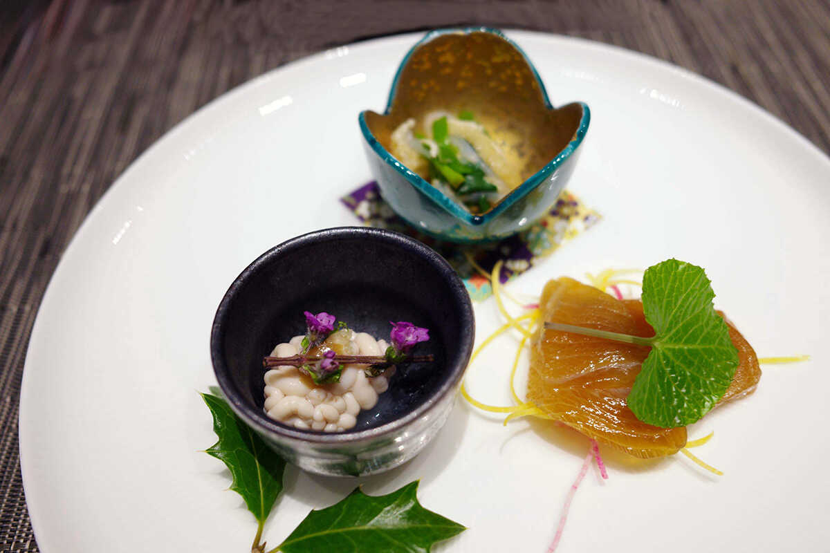 “前菜”は、3種類の盛り合わせ。濃厚な白子の塩麹漬け、葉わさびがのせられた寒ぶりの漬け、さっぱりとした芹のお浸しと三者三様。