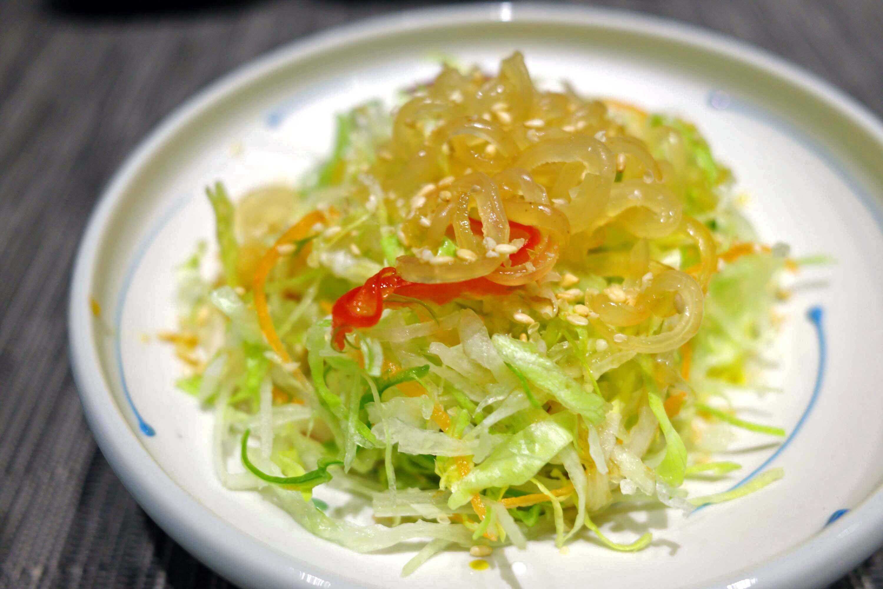 定番メニューが“さざんかサラダ”。レタスなどの葉野菜に、アクセントになるクラゲと金胡麻。全体をまとめあげる和風ドレッシングはノンオイルのため、後口をさっぱりとさせる。よく混ぜて食べると、様々な素材が複雑に広がる。