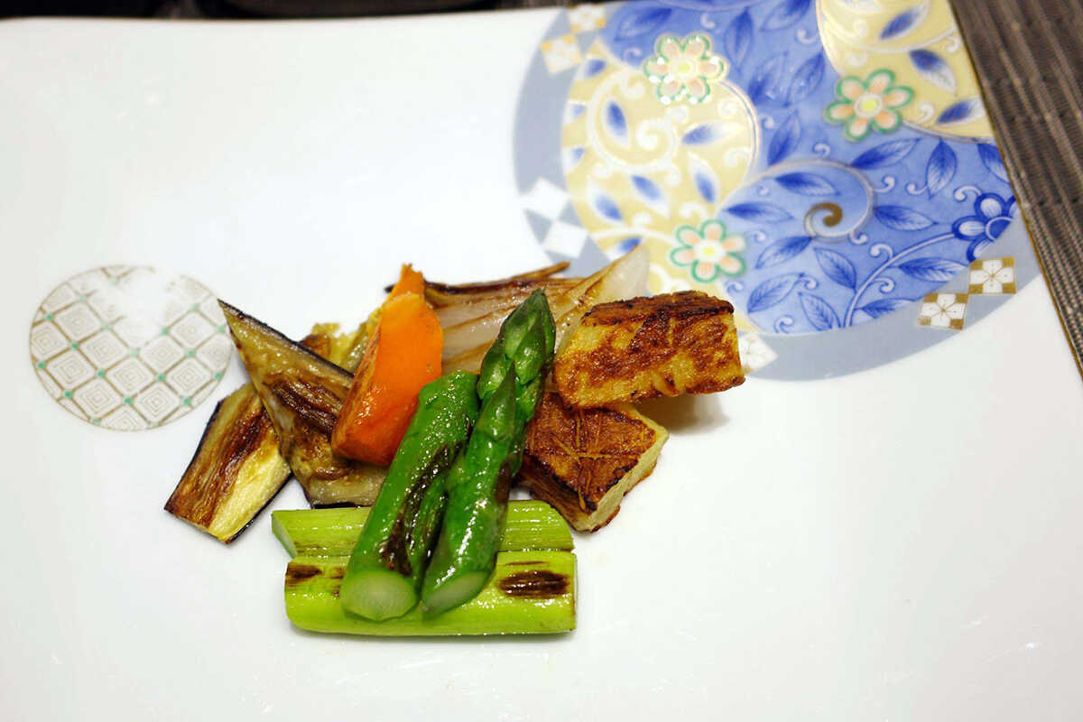 “季節の焼野菜”は、その時期焼き野菜として一番美味しく食べられる旬の野菜5種類。当日は、アスパラガス、淡路島のタマネギ、越冬にんじん、茄子、じゃがいも。アスパラガスはあざやかな緑でシャキシャキ感があり、淡路島産タマネギは驚くほど甘い。越冬にんじんは深みのある味わいで、茄子はとろけるような食感だ。じゃがいもはホクホクとしてしっかりとした甘味を感じる。