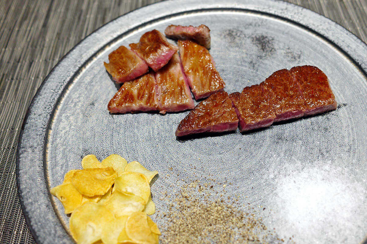 メインディッシュは全国から選りすぐった黒毛和牛で、フィレかサーロインをチョイスできる。複数人でオーダーすれば、フィレとサーロインをシェアすることも。フィレはシルクのようにきめ細かく、なめらかな肉質と上品な旨味。サーロインは口の中でほろりと崩れるような極上の脂の甘みが特徴。両者のコントラストが、これまたいい。どちらも噛むほどに肉汁があふれる匠の焼き加減。