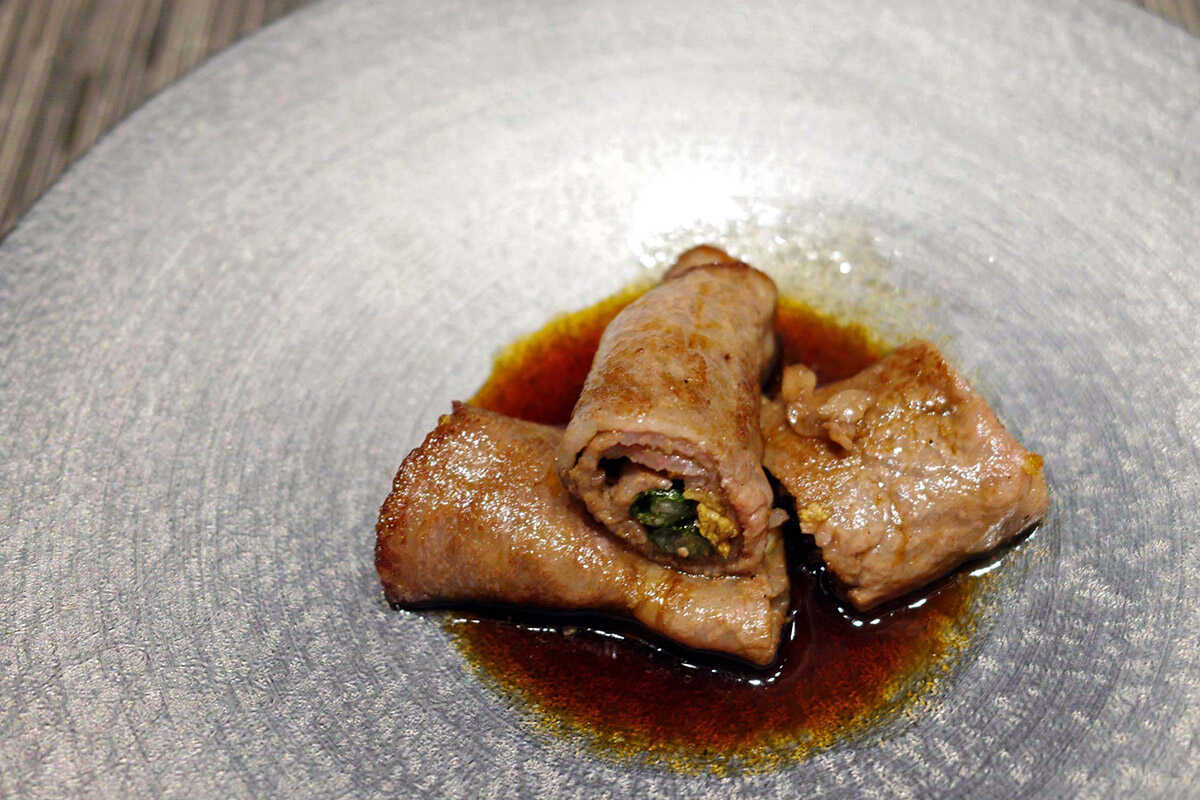 伝統の一品として是非とも追加オーダーしたいのが、“薄切り 黒毛和牛リブロース特製たれ焼き”(5000円~)。ネギと大葉を薄切りの大判リブロースで包んでいる。濃厚なリブロースの脂を、大葉とネギの青みがキリッと引き締める。こちらは重層的な味わいを体験でき、醤油ベースの特製タレが食欲をそそる。