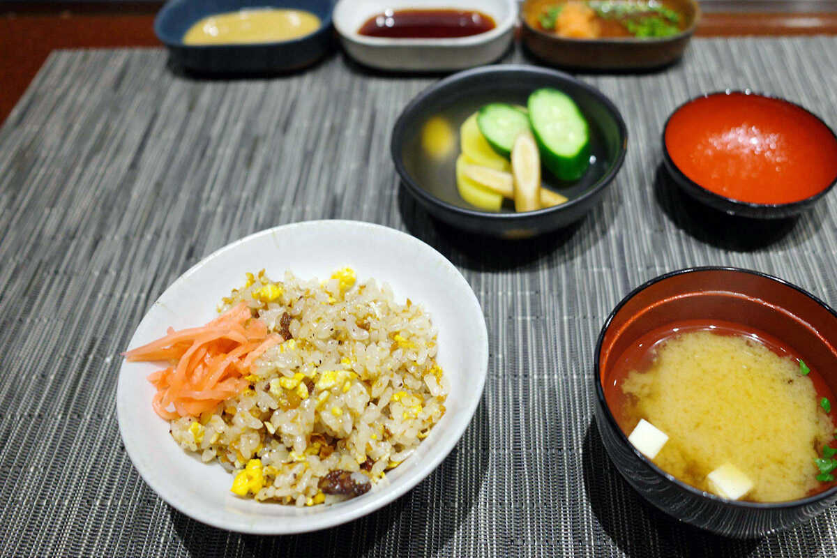 お食事は鉄板焼の王道、ガーリックライス。卵と和牛の脂身が、米一粒一粒をコーティングしてパラパラにする。立ちのぼるニンニクの香ばしさが、再び食欲を刺激する。紅生姜の酸味が絶妙なアクセントとなり、お腹がいっぱいでも夢中になる、至福の味わいだ。