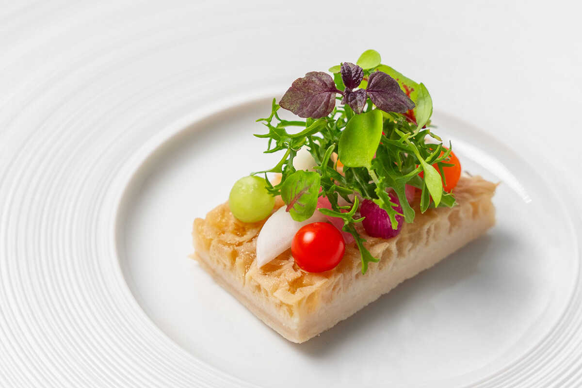 続く“トリッパ サラダ”は、イタリア伝統の“トリッパ・イン・インサラータ”をコンテンポラリーに再解釈。愛媛県産トリッパをイタリア産ビネガーと今治産オリーブオイルでマリネし、90℃で16時間かけて優しくスチーム調理を施した。驚くほどの柔らかさと澄んだ味わいに、フレッシュトマトの搾り汁を合わせたドレッシングが軽やかに寄り添う。