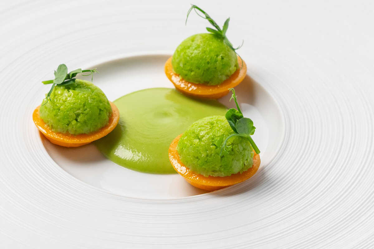 “ソラマメ ペコリーノ”は、トスカーナの素朴な旬の取り合わせを昇華させたパスタ料理。自家製ボットーネに2種のペコリーノを詰め、わずか1分だけ火入れした瑞々しいそら豆となめらかなソースを重ねることで、見事な均衡を保っている。