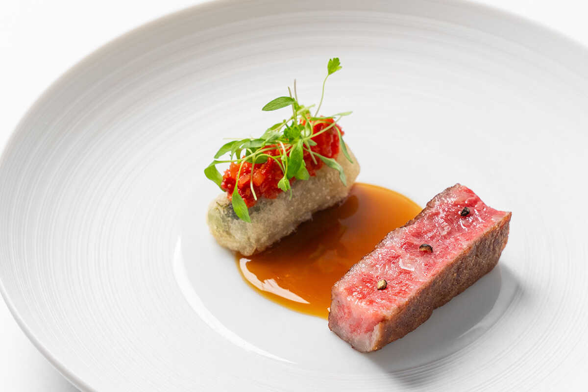 メインディッシュの“アカウシ グリーンアスパラガス”は、愛媛県産あか牛のサーロインと地元産グリーンアスパラガスの見事な取り合わせ。ライスペーパーで包み米粉で揚げたクリスピーなアスパラガスが、柔らかな肉質と絶妙なコントラストを生む。牛骨の旨味にマルサラワインを重ねたソースが、一皿を豊かにまとめ上げている。