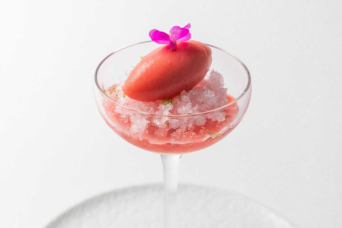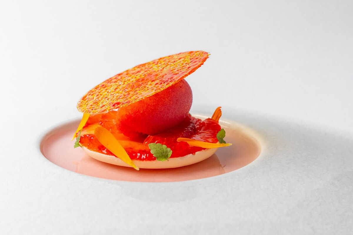 食事の余韻を彩るデザートも秀逸。“苺”は愛媛県産苺のソルベに桜のグラニテを合わせ、冷涼感と香りの重なりを表現。そしてメインデザートの“ブラッドオレンジ”は、愛媛県産のブラッドオレンジを主軸に、梅酒のジュレやチーズケーキを合わせた一皿。柑橘の酸味と乳の旨味が調和し、愛媛を巡るガストロノミーの旅をあざやかに締めくくってくれる。