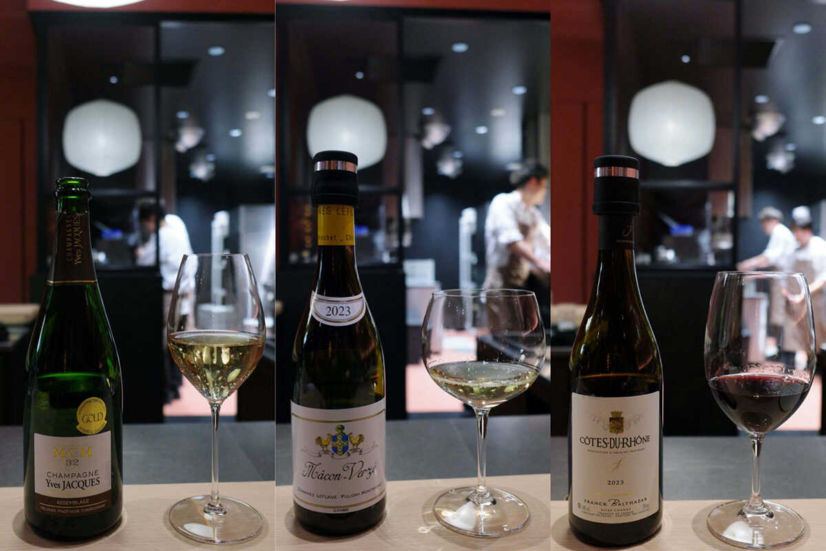 左から、“イヴ・ジャック MCM 32 ブリュット”、“ドメーヌ・ルフレーヴ マコン・ヴェルゼ 2023”、“フランク・バルタザール コート・デュ・ローヌ 2023”