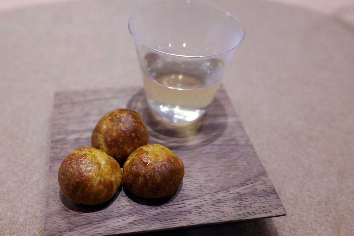 最初に提供されるのは、グジェールと“オリエンタル出汁”。“オリエンタル出汁”は、利尻昆布の出汁を、まぐろ節、エストラゴンなどのハーブをとおして抽出。旨味とさわやかさを併せ持つオリジナルの出汁だ。このオリエンタル出汁や昆布出汁をベースにしたスープやソースも生み出している。
