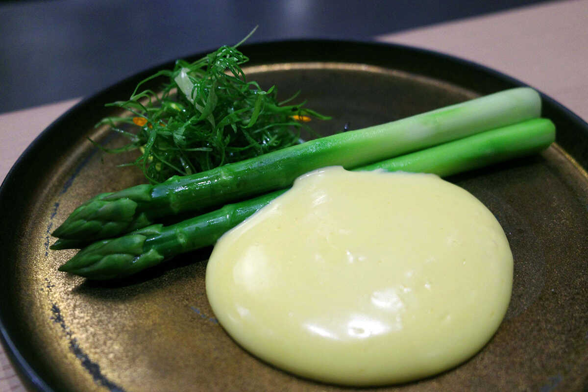 “グリーンアスパラガス オランデーズソース”(1600円)は、緑色が美しい北海道のグリーンアスパラガスの濃厚な味わいを楽しめる。エスプーマから絞ったオランデーズソースは、ふわふわの食感。