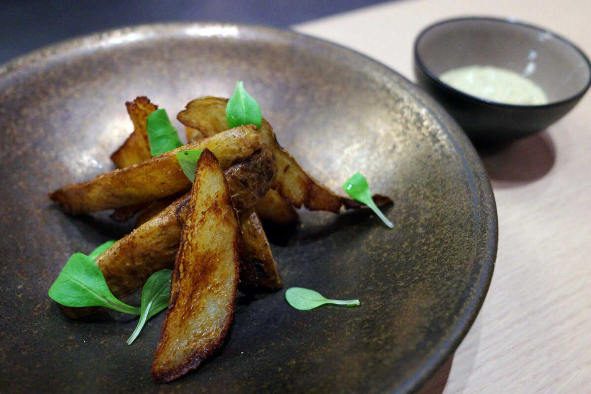 人気なのが、“自家製フライドポテト 味噌タップナード”(1000円)。皮付きのナチュラルタイプのフライドポテトで、洗ってから蒸し、急速冷凍して甘味と旨味を閉じ込め、最後に揚げる。冷凍したことで細胞が壊れているため、中はほっくり、外はカリッと仕上がるのだ。赤味噌と白味噌、オリーブ、ケッパー、ワインビネガーのソースとの相性も抜群。