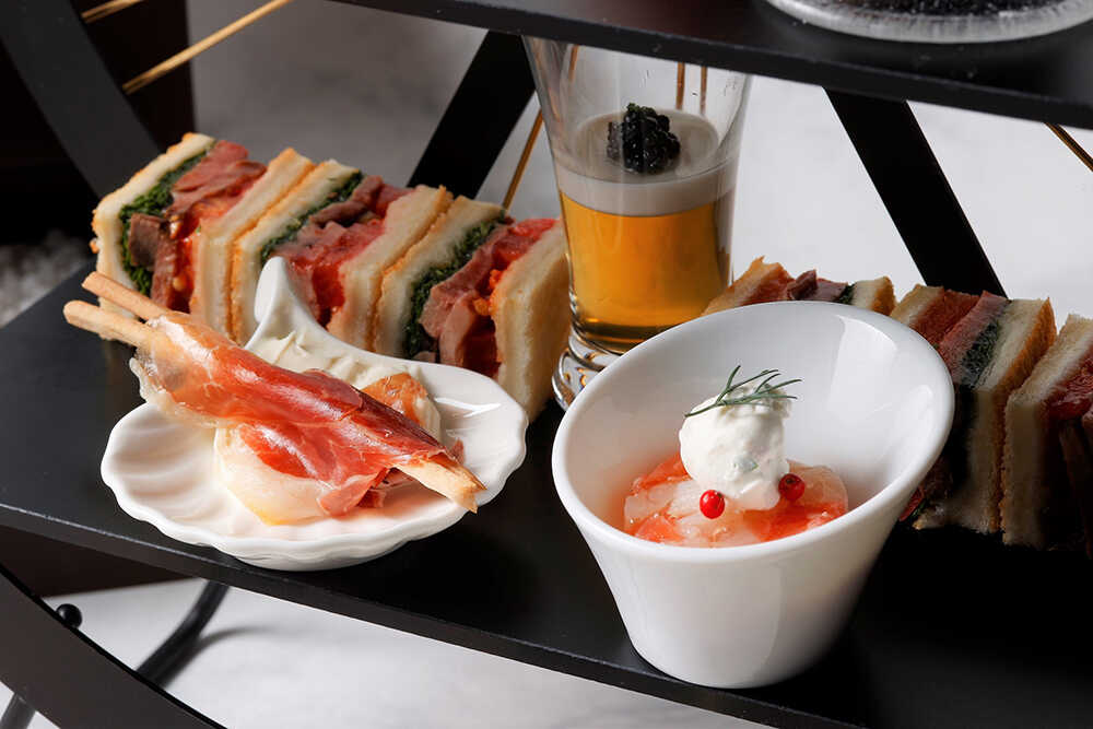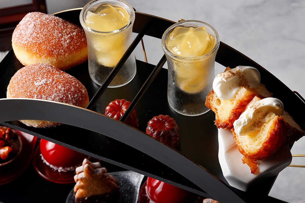 ラウンジで好評を博す季節のアフタヌーンティーが、ホリデーシーズンに合わせてより華やかに。サンタクロースの帽子をモチーフにした赤い果実のムース『ルージュ』や、南国の香りをまとった『サブレ・ザ・カハラ』は、その姿がまるで飾り付けられたオーナメントのようだ。セイボリーには、松阪牛やキャビアといった贅を尽くした食材を用意。