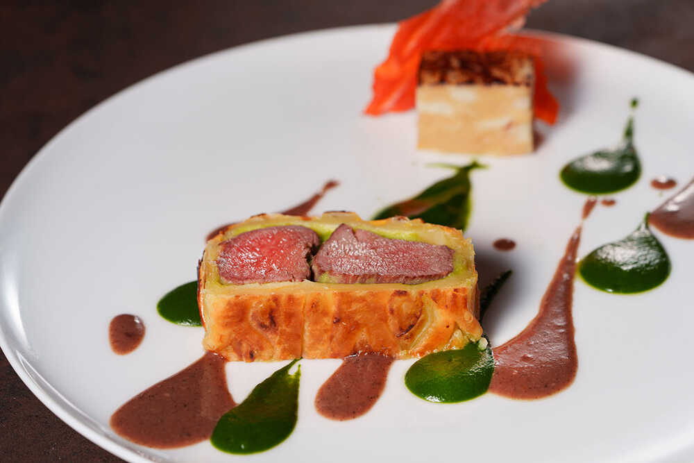 メインの仙台牛"みやぎ美らいす"フィレ肉と岩手の鹿肉のパイ包み焼きは、肉の旨味を引き出すマッシュルームと春菊のソースが絶妙。噛みしめるたびに、東北の冬の力強さを感じられる逸品だ。