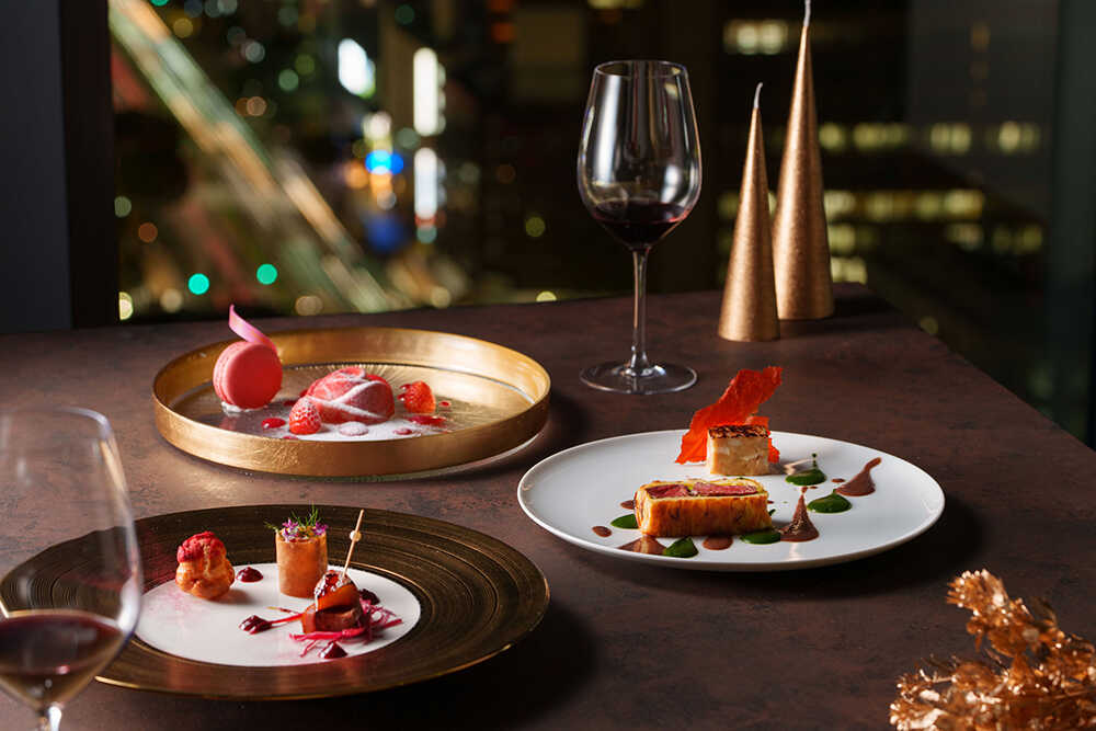 眼下に広がるのは、冬の街を照らす光の海。その眺めを前に、シャンパンを片手にグラスを合わせる瞬間から、聖夜の物語がはじまる。